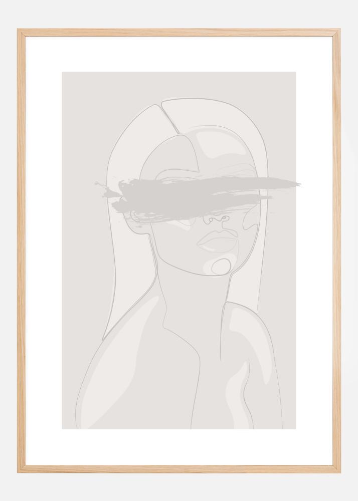 Un póster abstracto con una mujer con los ojos cubiertos. Esta imagen tenue en blanco y gris muestra la cabeza y los hombros de una mujer en formas de bloques y líneas. Un toque de color cubre los ojos, creando misterio alrededor de la mujer. Un fuerte borde blanco la enmarca, perfecto para colgar en una pared de color audaz en el hogar.
