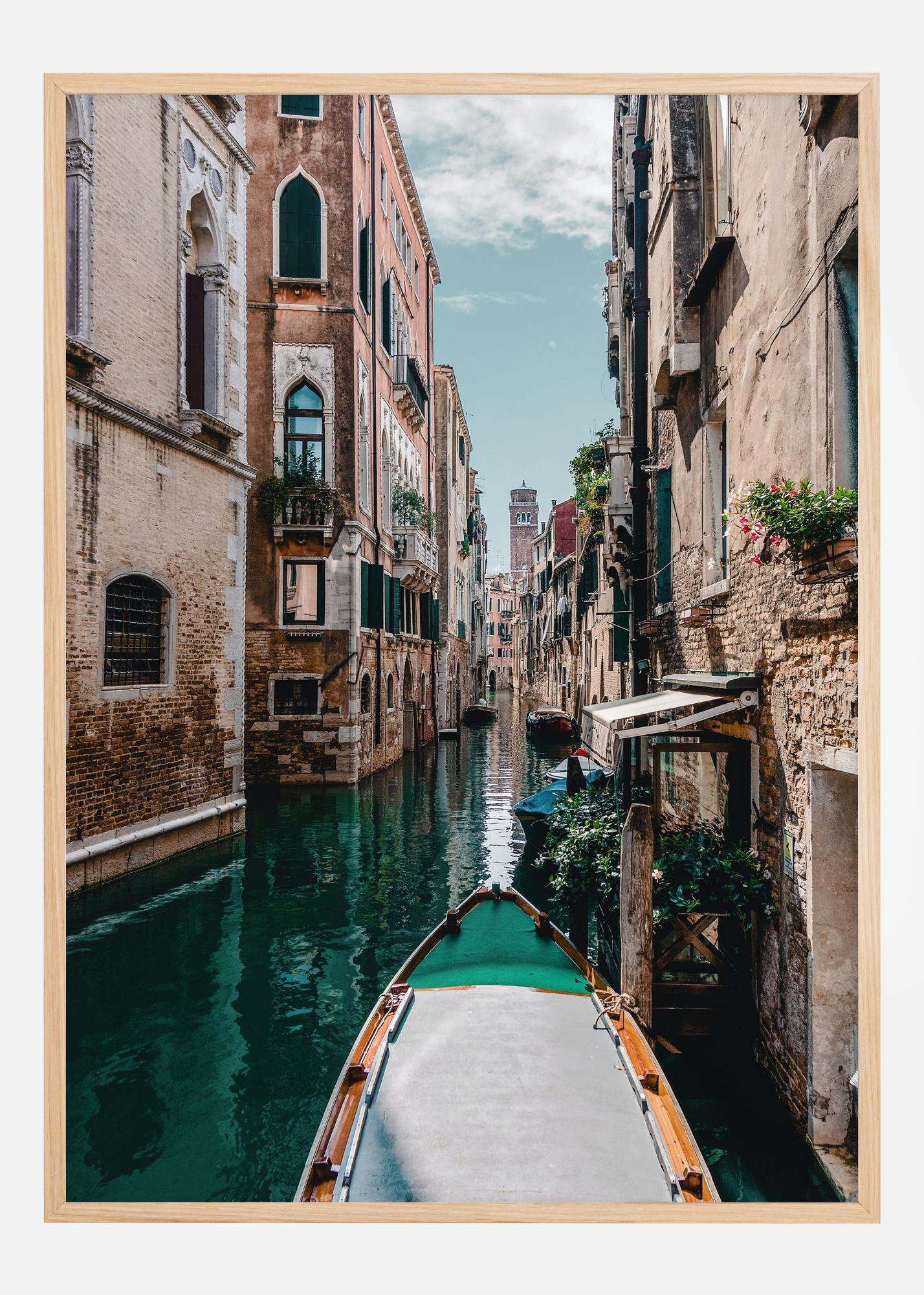 Este cartel cautivador captura la esencia de un pintoresco canal en Venecia, completo con una góndola tradicional en primer plano. La luz cae hermosamente sobre las coloridas fachadas de los edificios circundantes, y las reflexiones en el agua tranquila crean un espejo que es tanto claro como fascinante. Los matices de rojos terrosos y tonos anaranjados en el ladrillo de los edificios se contrastan con el sereno color verde azulado acuático del canal.