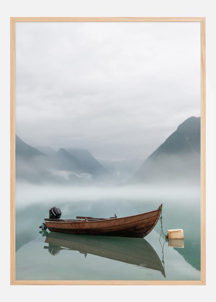 Un elegante póster con un barco en el centro de un lago cubierto de niebla. Un barco marrón destaca en detalle en primer plano con un reflejo nítido en el agua. En el fondo, envuelto en la niebla, se encuentran suaves montañas que se elevan desde el agua. Disfruta de la tranquilidad de un paisaje abierto en tu hogar.