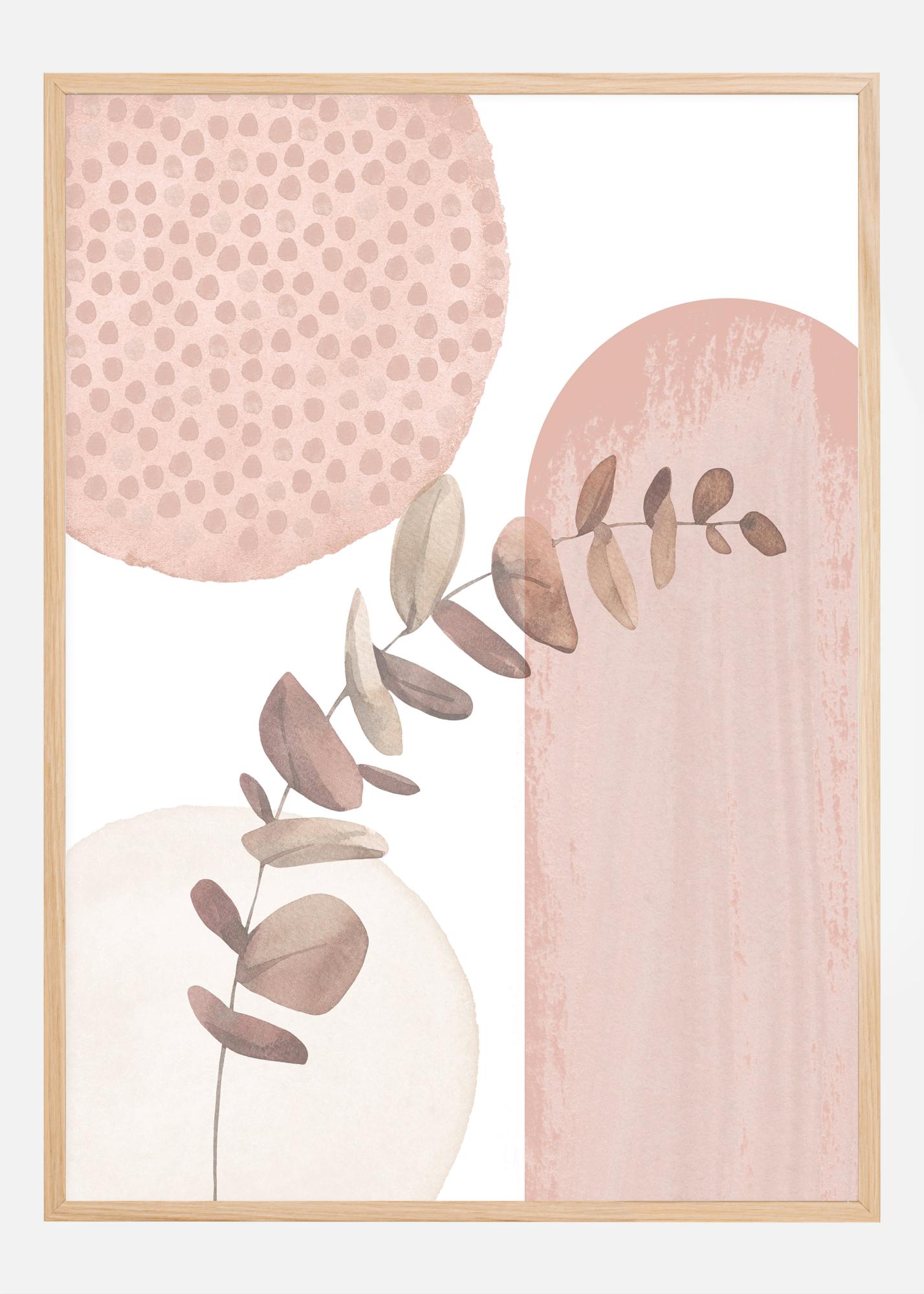 Este póster tranquilo y elegante presenta una sofisticada y minimalista ilustración floral en una paleta agradable de tonos rosados y neutros. El motivo, que parece fluir sobre varias formas abstractas, es tanto moderno como atemporal. Una sencilla rama de planta con hojas elegantes se extiende a lo largo de la composición, mientras que el fondo de patrones circulares y colores suaves crea una sensación de espacio y profundidad. Esta impresión artística es un excelente detalle decorativo para todos aquellos que aprecian colores tranquilos y un diseño sutil en su hogar.