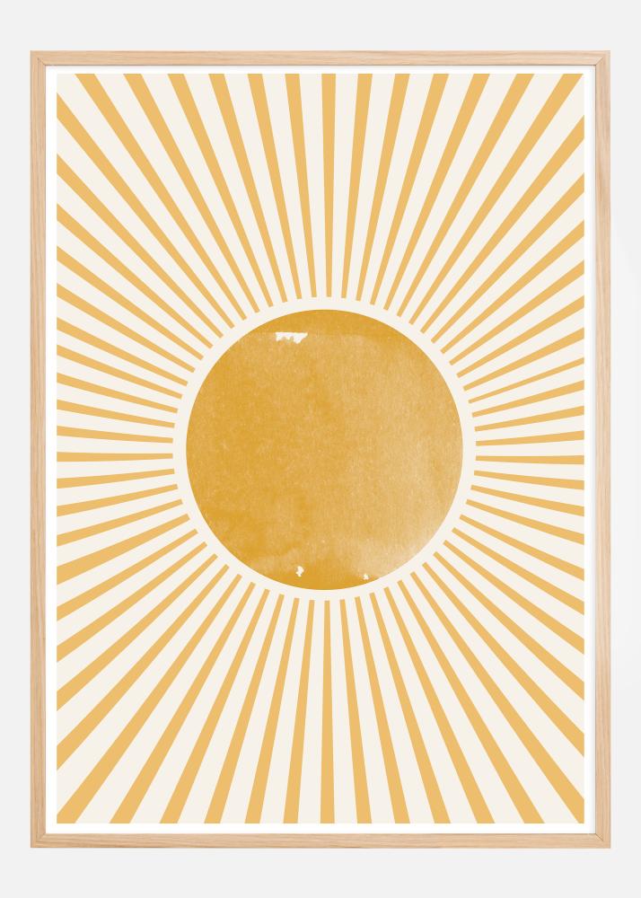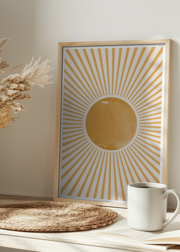 Este póster vibrante evoca la sensación de un sol radiante con sus líneas irradiadas en tonos dorados que rodean un círculo amarillo central sobre un fondo blanco suave. El diseño está inspirado en patrones bohemios y geométricos, que juntos crean una imagen del calor y la energía del sol. Los colores cálidos y el patrón radiante están diseñados para ofrecer una sensación de alegría y positividad.