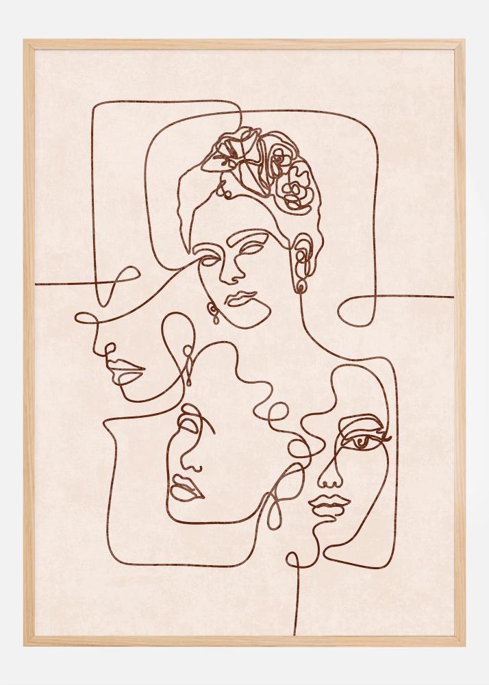 Da a tu hogar un toque artístico con este elegante póster que celebra la belleza y la fuerza de la feminidad. En una sola línea entrelazada se delinean cuatro rostros de mujeres como una imagen de unidad y diversidad. Cada perfil está realizado con una simplicidad que habla a la imaginación del espectador, lo que convierte a este póster en un perfecto iniciador de conversación. Vestido en un sofisticado tono beige, el fondo invita a una sensación de calidez y suavidad, mientras que las líneas marrones ofrecen un fuerte contraste visual.