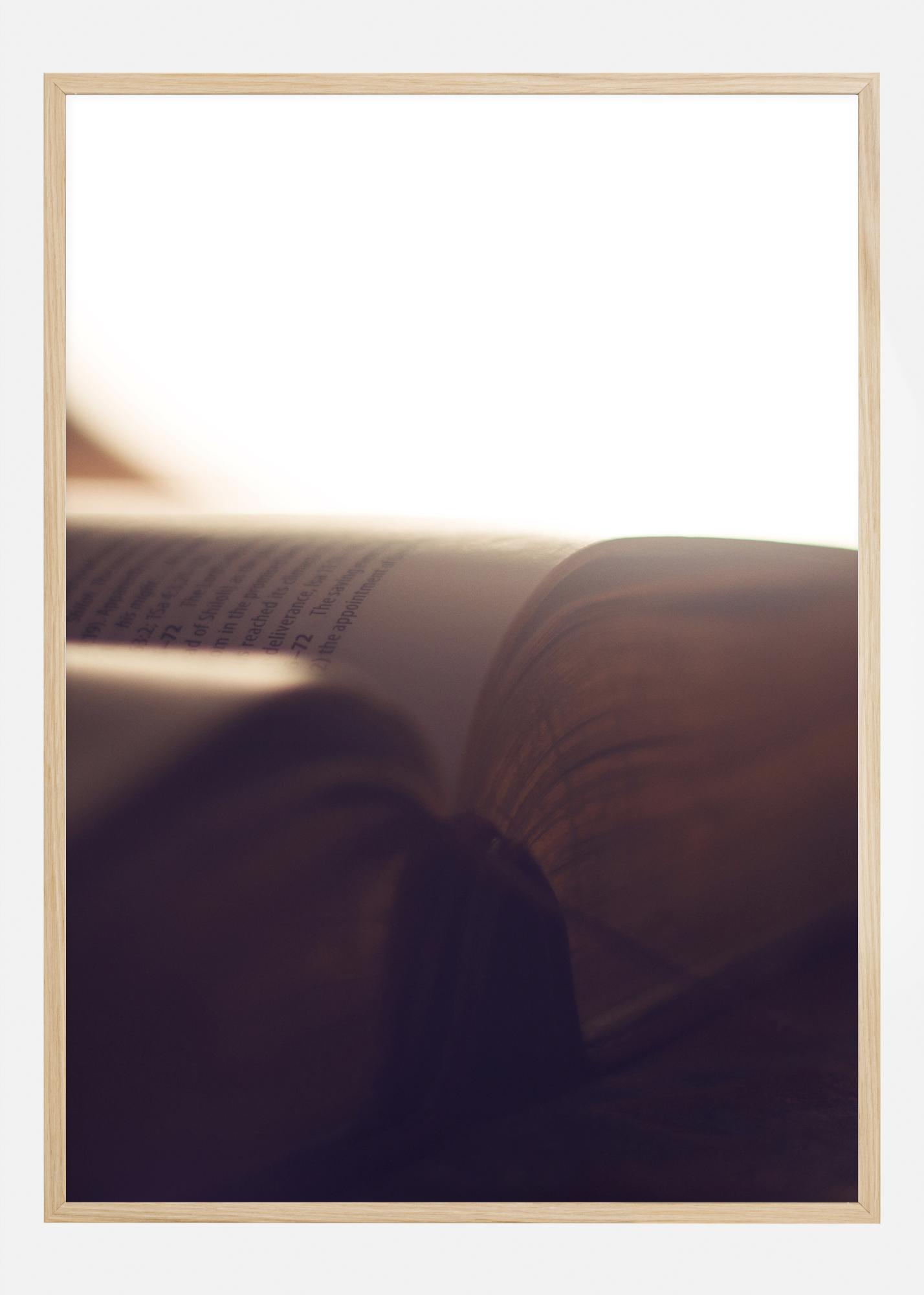 Un póster de primer plano con un libro abierto. La luz blanca llena la mayor parte de esta imagen, ya que brilla sobre el libro con los bordes dorados de las páginas. Las palabras son apenas visibles, lo que hace que esta sea la impresión perfecta para una sala de estudio.