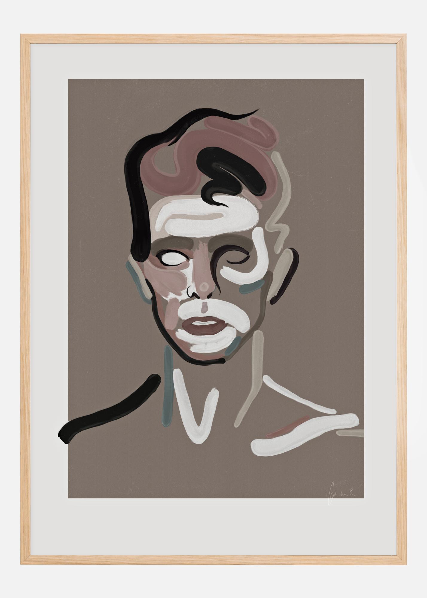 Un póster abstracto de retrato con David Bowie hecho con pinceladas gruesas. Se utilizan los colores blanco, negro, azul y rosa para crear un retrato impactante. Los trazos audaces delinean su rostro mientras mira y forman una obra abstracta convincente, perfecta para dar vida a una pared común.