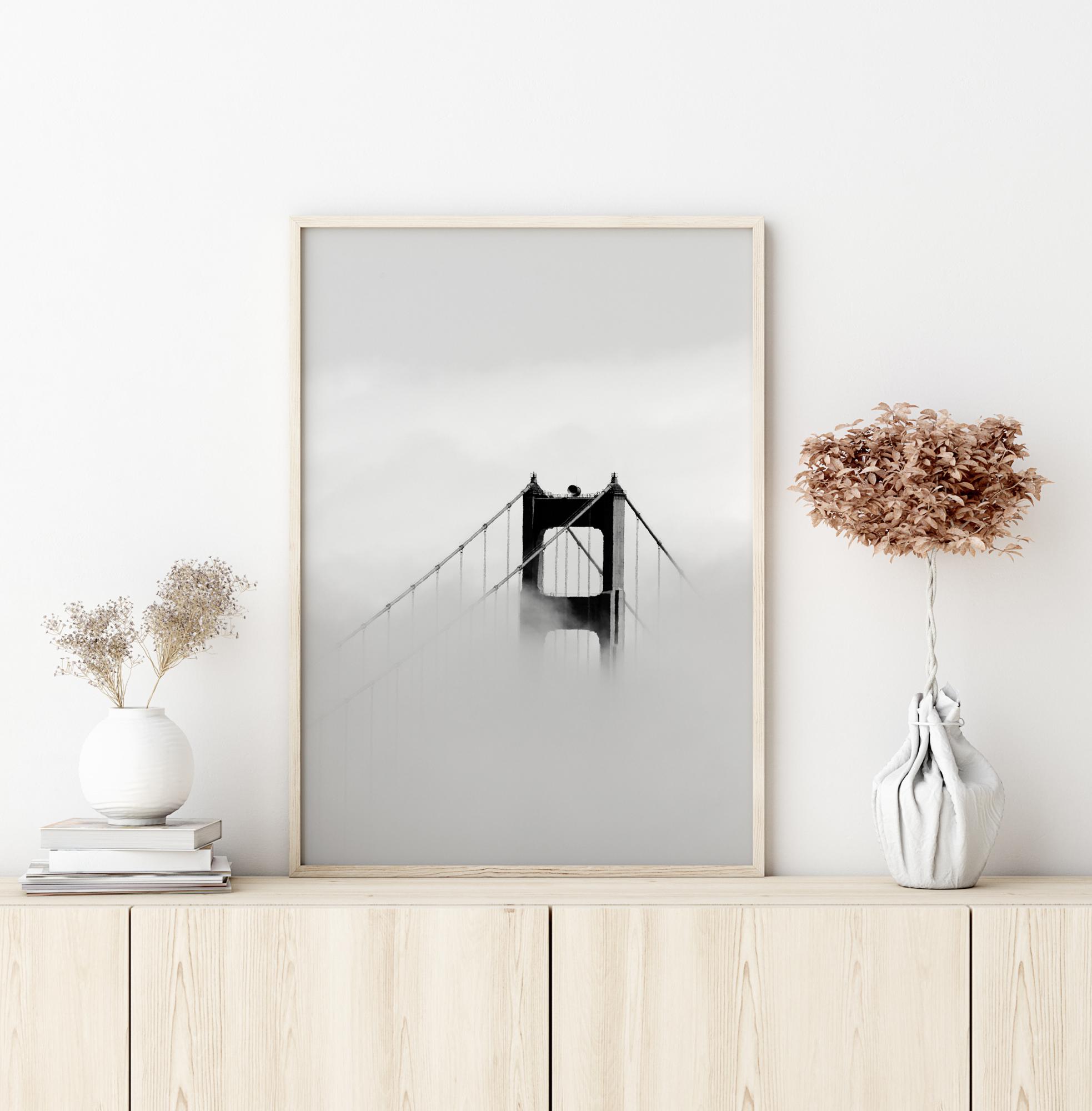Un póster llamativo con la parte superior de un puente. La niebla se eleva y oculta todo el puente excepto la parte superior. Negro y sólido, el puente se eleva entre el cielo nublado arriba y la niebla abajo. Disfruta de esta fantástico imagen cuando tengas este póster en la pared.
