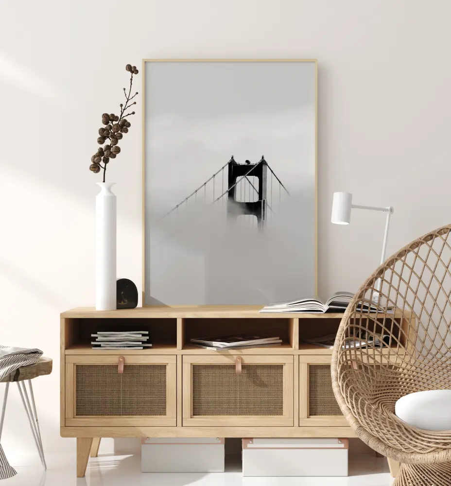 Un póster llamativo con la parte superior de un puente. La niebla se eleva y oculta todo el puente excepto la parte superior. Negro y sólido, el puente se eleva entre el cielo nublado arriba y la niebla abajo. Disfruta de esta fantástico imagen cuando tengas este póster en la pared.
