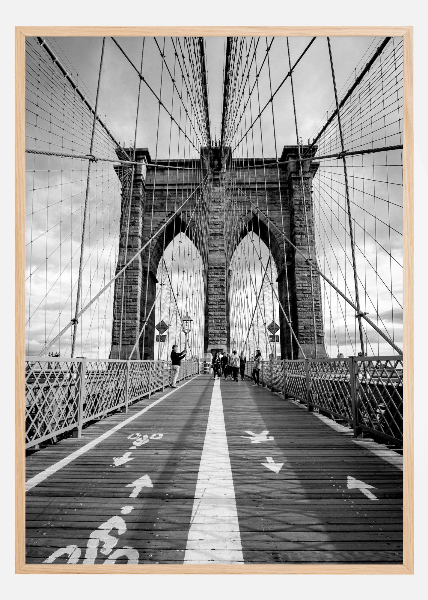 Una fotografía en blanco y negro del puente de Brooklyn, con su fascinante pasarela, torres imponentes y emocionante sistema de suspensión compuesto por cables de acero en una gran cuadrícula. Un póster que se ve excelente en combinación con otros favoritos en un collage más grande.