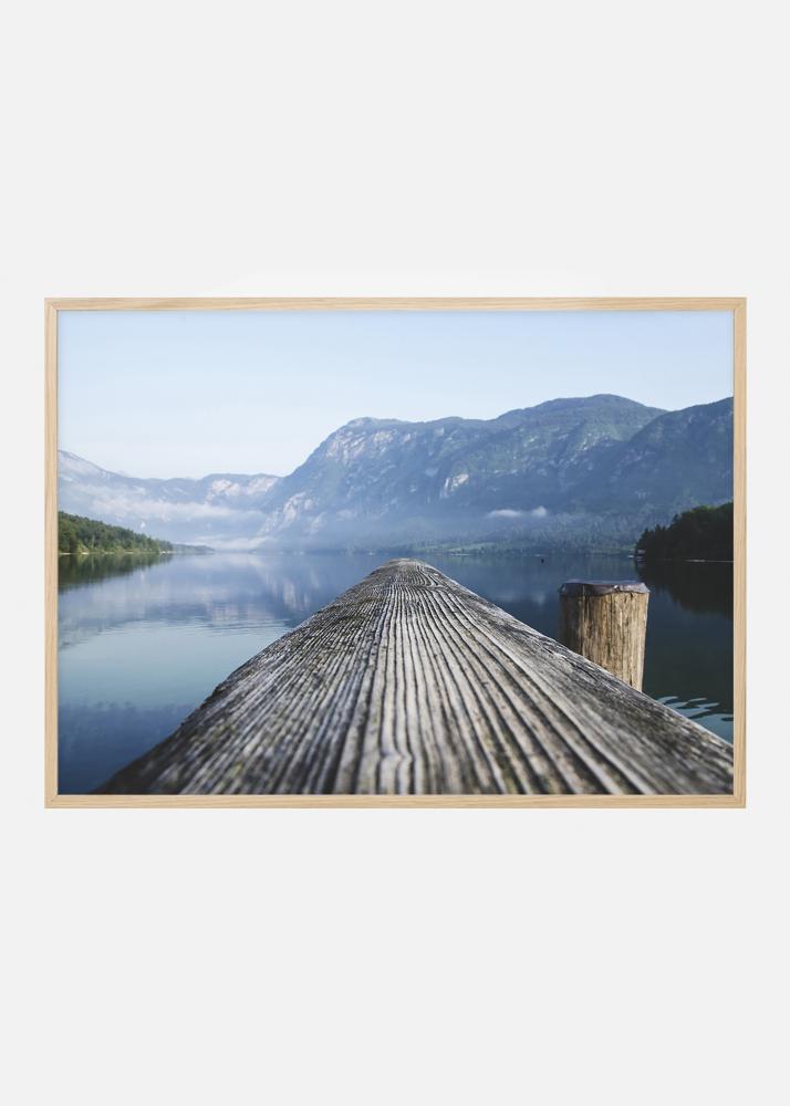 Vista de un fascinante paisaje de fiordos desde un muelle desgastado por el clima. Impresión del paisaje en tonos azules que queda igual de bien como cuadro solitario en la pared como junto con accesorios marinos u otros cuadros. Compleméntalo con un marco de madera gris para resaltar los colores del cuadro, o un marco negro más fino para lograr una expresión más minimalista.