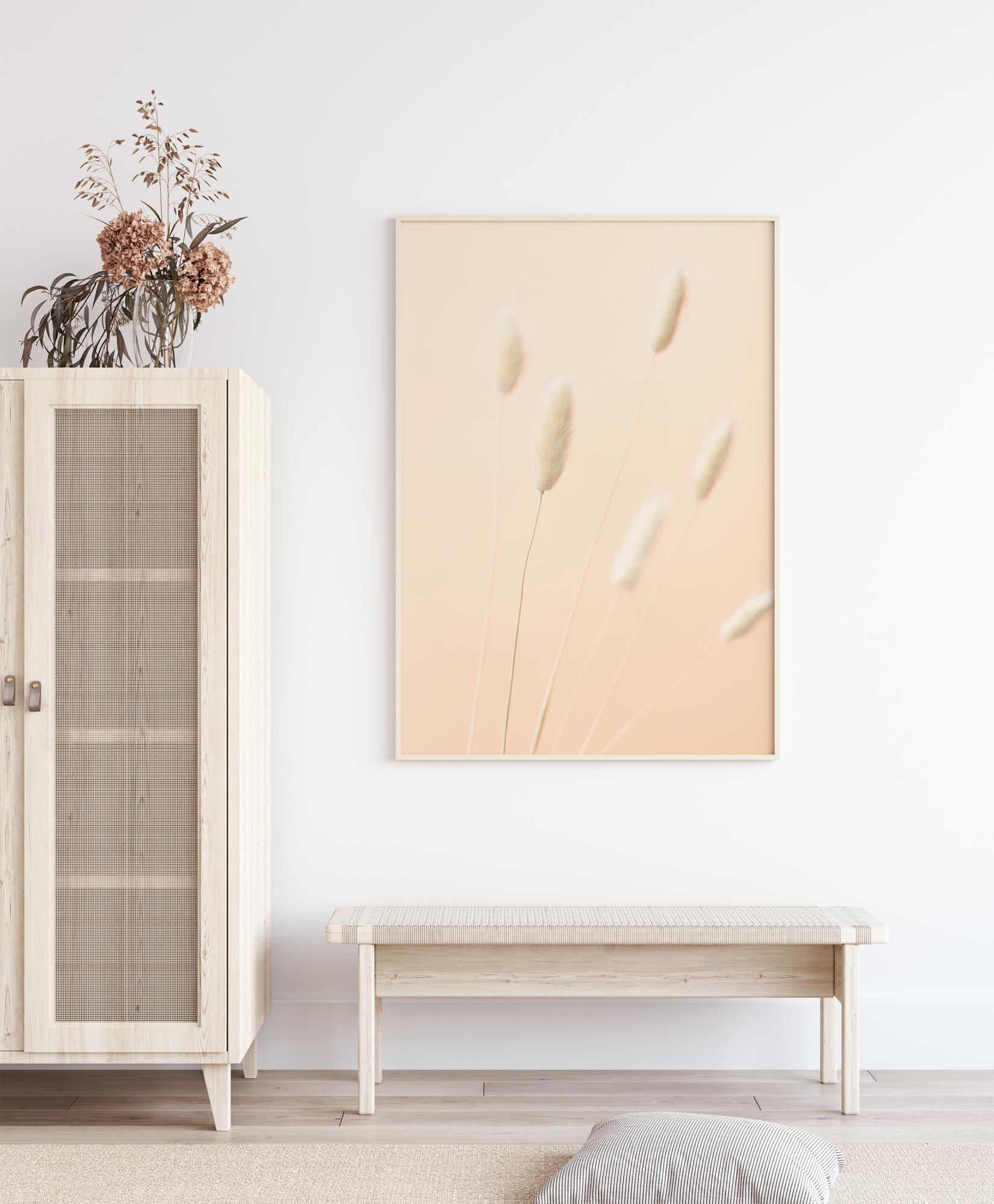 Un sencillo póster de flores con un poco de cola de conejo en un jarrón. Los tallos ligeros y aireados casi pintan la pared detrás. Estos sutiles colores pastel funcionan perfectamente junto con otros colores, o incluso con una pared completamente blanca.