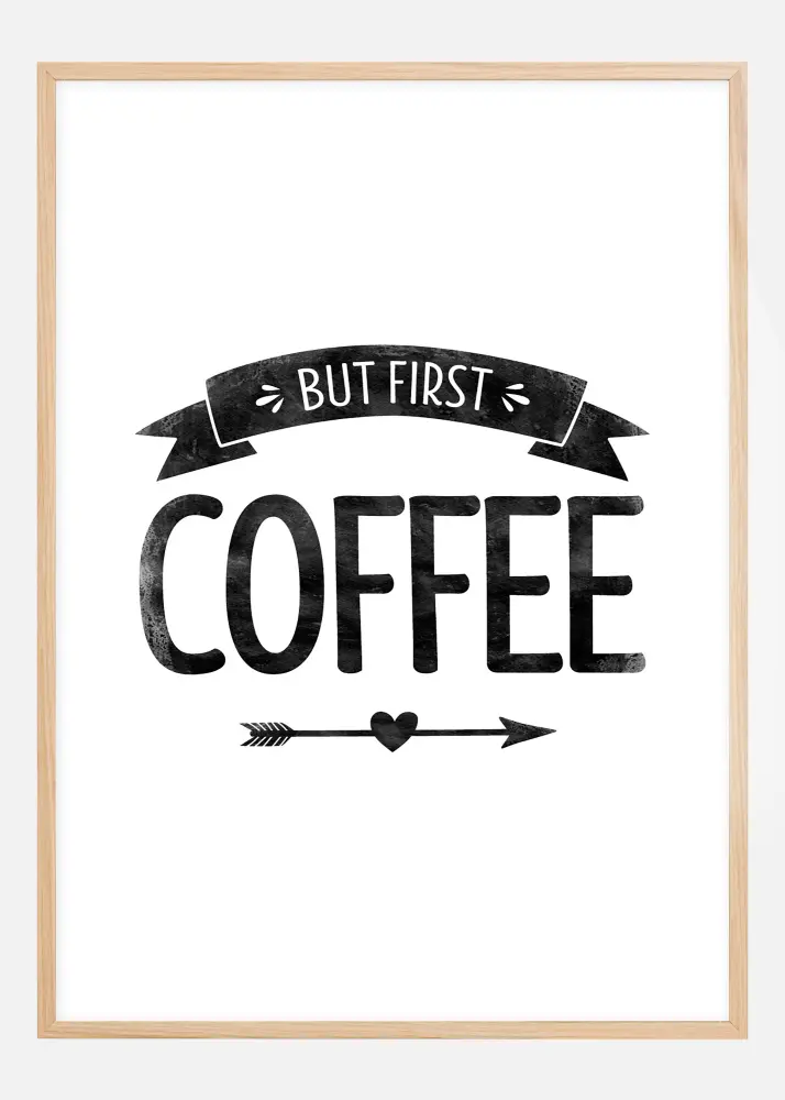 Crea una sensación acogedora y retro en la cocina o en el trabajo con este encantador póster. El póster es en blanco y negro y tiene el texto "But first coffee" junto con una pancarta y una flecha que atraviesa un corazón. Los cuadros de cocina suelen quedar muy bien con marcos plateados que combinan con el fregadero, el grifo y otros detalles de metal que suelen estar en una cocina. Elige entre 6 formatos diferentes según el tamaño del área en la que se colocará el póster.
