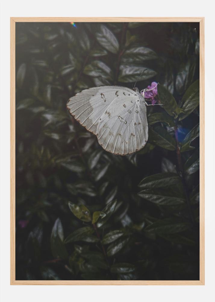 Descubre la silenciosa belleza de la naturaleza a través de este evocador póster que representa una delicada mariposa en reposo. Está elegantemente colocada contra un fondo frondoso de hojas verde oscuro, y sus alas blanco pálido con sutiles patrones de gris y negro destacan su fragilidad y gracia. Esta imagen es un sereno recordatorio de los momentos fugaces y encantadores de la naturaleza.