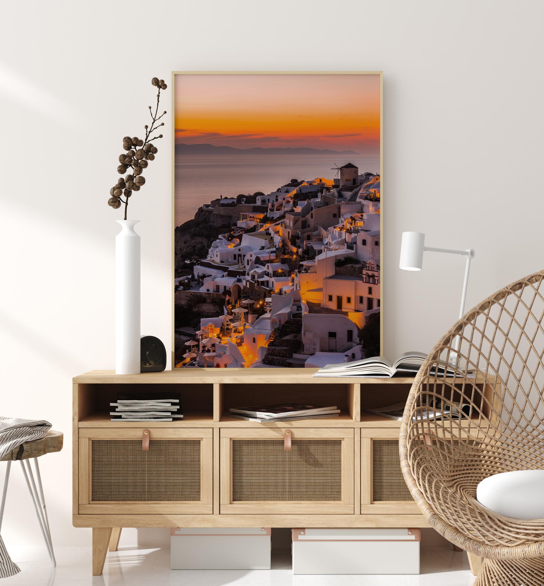 Un póster escénico con Calisera Santorini al atardecer. La pequeña ciudad brilla suavemente en la luz de la calle. Las casas blancas destacan con el suave y brumoso mar y las montañas de fondo con el cielo alegre en el atardecer. Viaja sin salir de casa mientras observas este póster.