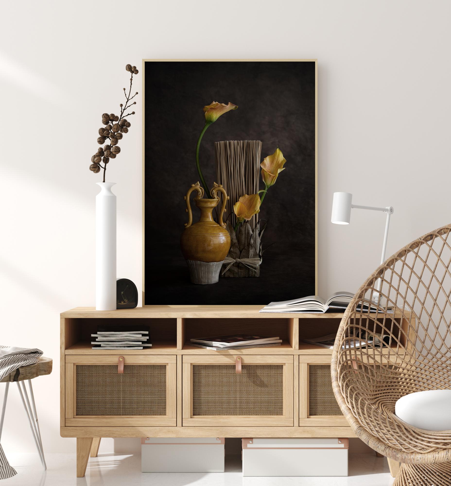 Un póster de bodegón (bodegón (naturaleza muerta)) con una jarra, tallos marrones secos y tres flores de lirio. Un fondo negro hace que la jarra de color mostaza y los tres lirios amarillos destaquen fuertemente. Un lirio se inclina hacia arriba hacia la parte superior y guía la mirada alrededor de la obra. Cuélgalo para darle un toque de elegancia a tu hogar.