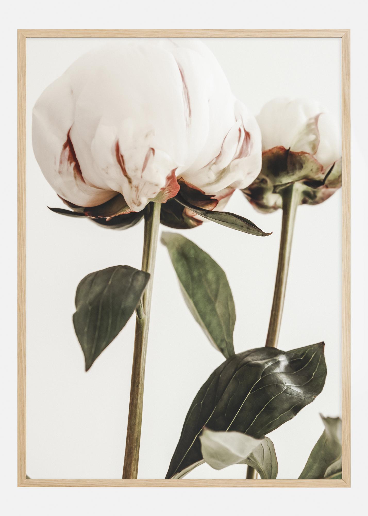 Este póster captura la belleza excepcional de las peonías en plena floración. Las grandes y esponjosas flores, con sus pétalos suavemente plegados en tonos de blanco y rojo óxido, se alzan orgullosamente sobre sus fuertes tallos. Las hojas de un verde profundo forman un poderoso fondo que resalta la delicada estructura y los ricos tonos de color de las flores.