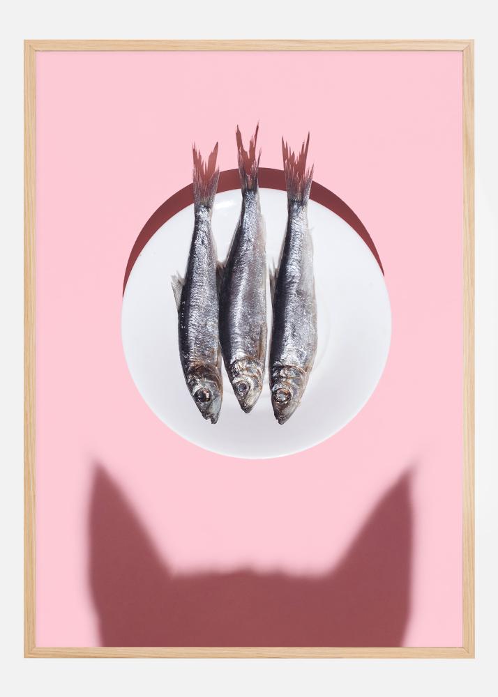 Los colores dominantes en esta impresión son un fondo rosa pastel que armoniza con el blanco del plato y el plateado de los peces, lo que refuerza la textura y forma de los elementos visuales. El juego de luces entre los objetos y el fondo capta la atención del espectador y contribuye a una sensación dinámica en la imagen. Este póster no es solo una obra de arte para los amantes de la comida y los entusiastas de los gatos, sino también para aquellos que aprecian la belleza de la simplicidad y un sutil toque de humor en el diseño de interiores.
