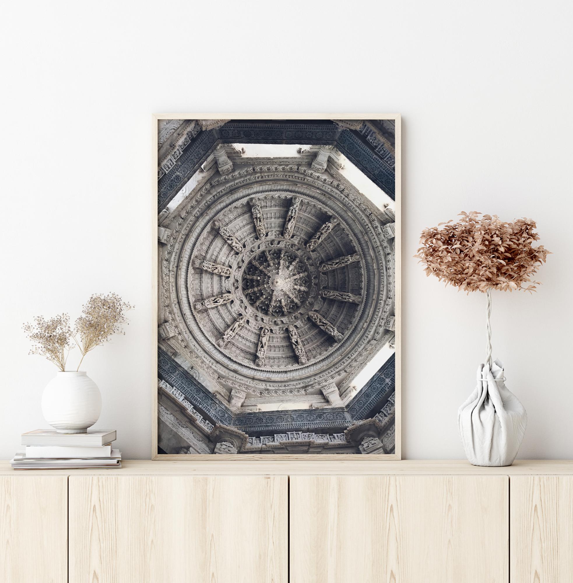 Un póster en blanco y negro con un techo gris. El techo está diseñado con círculos y parece una rueda de barco. Rodeado por un octógono, tiene formas geométricas por todas partes. Dale un poco más de vida a una pared suavemente azul colgando este póster de techo.