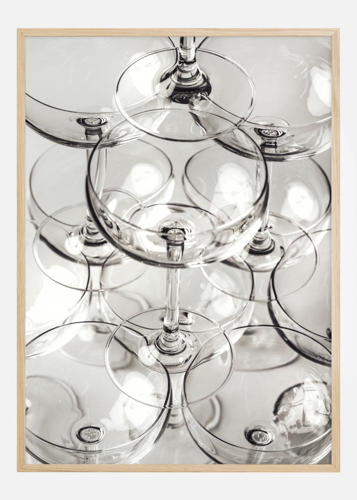 Este elegante y sofisticado póster captura la belleza y claridad de una cascada de copas de champán. La imagen representa un primer plano de la ingeniosa estructura del vidrio, donde la luz se refleja y refracta a través del material transparente, creando una danza de luces y sombras. La riqueza de detalles y la precisa delicadeza en la composición destacan las formas delicadas de los vasos y las sutiles tonalidades en el vidrio.