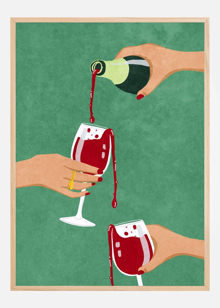 Este cartel lúdico y sofisticado captura la esencia de la amistad y la celebración. La ilustración muestra tres manos sosteniendo elegantemente copas de vino y una botella, donde un chorro de vino tinto se vierte en una de las copas. Esta escena es un homenaje a los pequeños momentos que hacen que la vida sea especial, y es una elección ideal para quien desee añadir una sensación de unidad y festividad a su hogar. La impresión es tanto un iniciador de conversación como un detalle decorativo de interiores.
