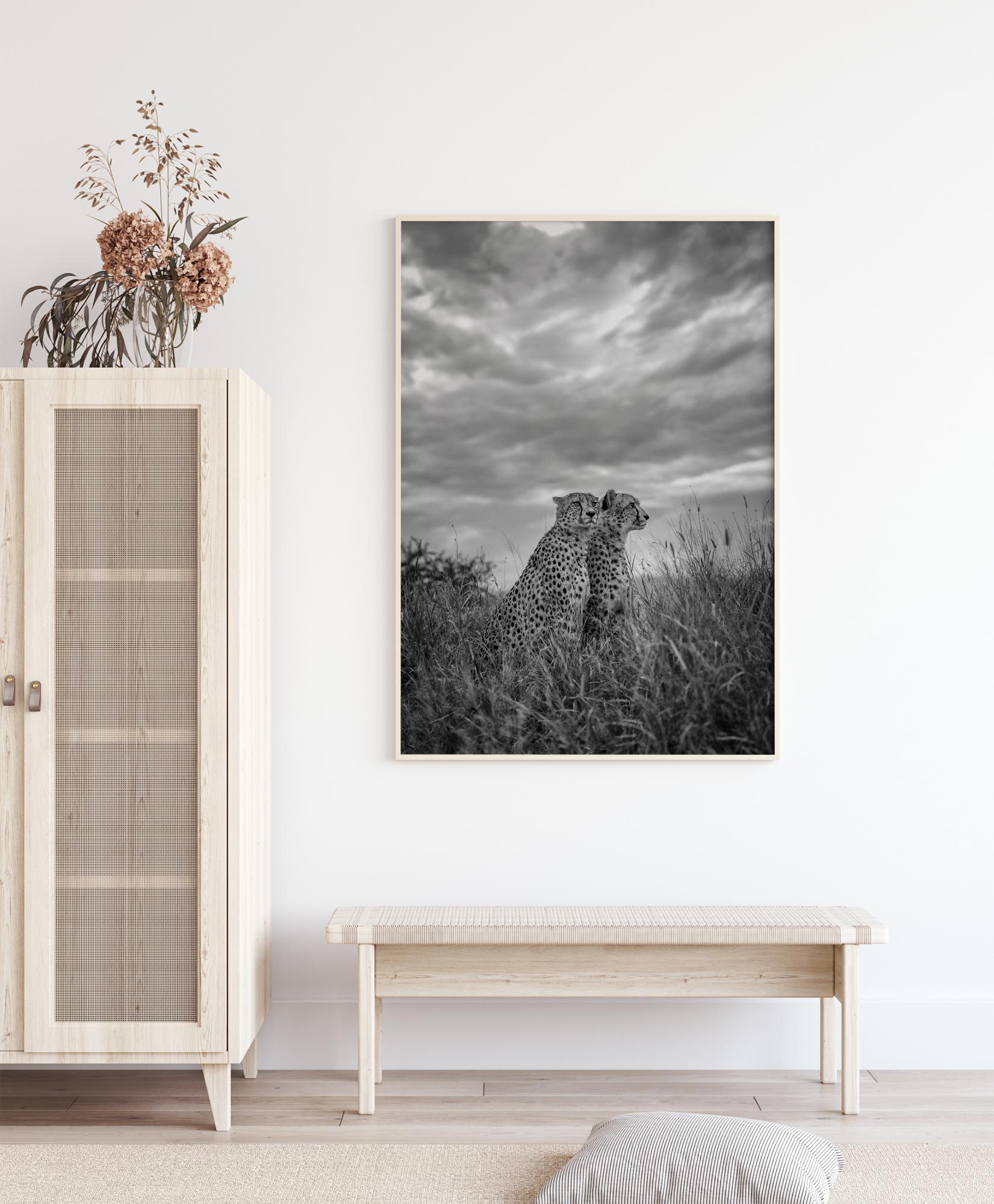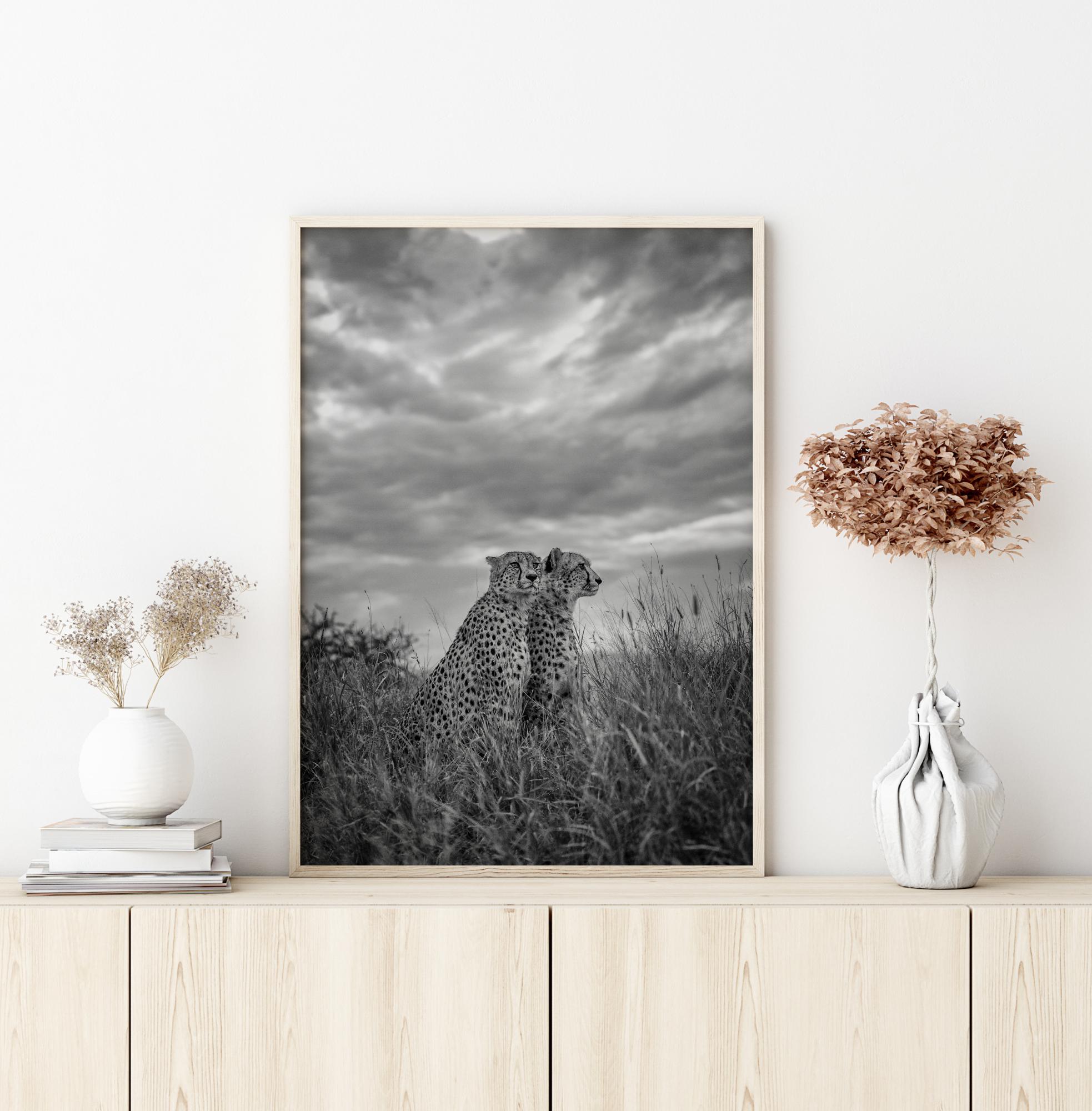 Un póster de naturaleza con dos guepardos mirando hacia las llanuras africanas. El cielo nublado contrasta con las fantásticas manchas de estos animales. Con este póster, puedes llevar la grandeza de la naturaleza a tu hogar.