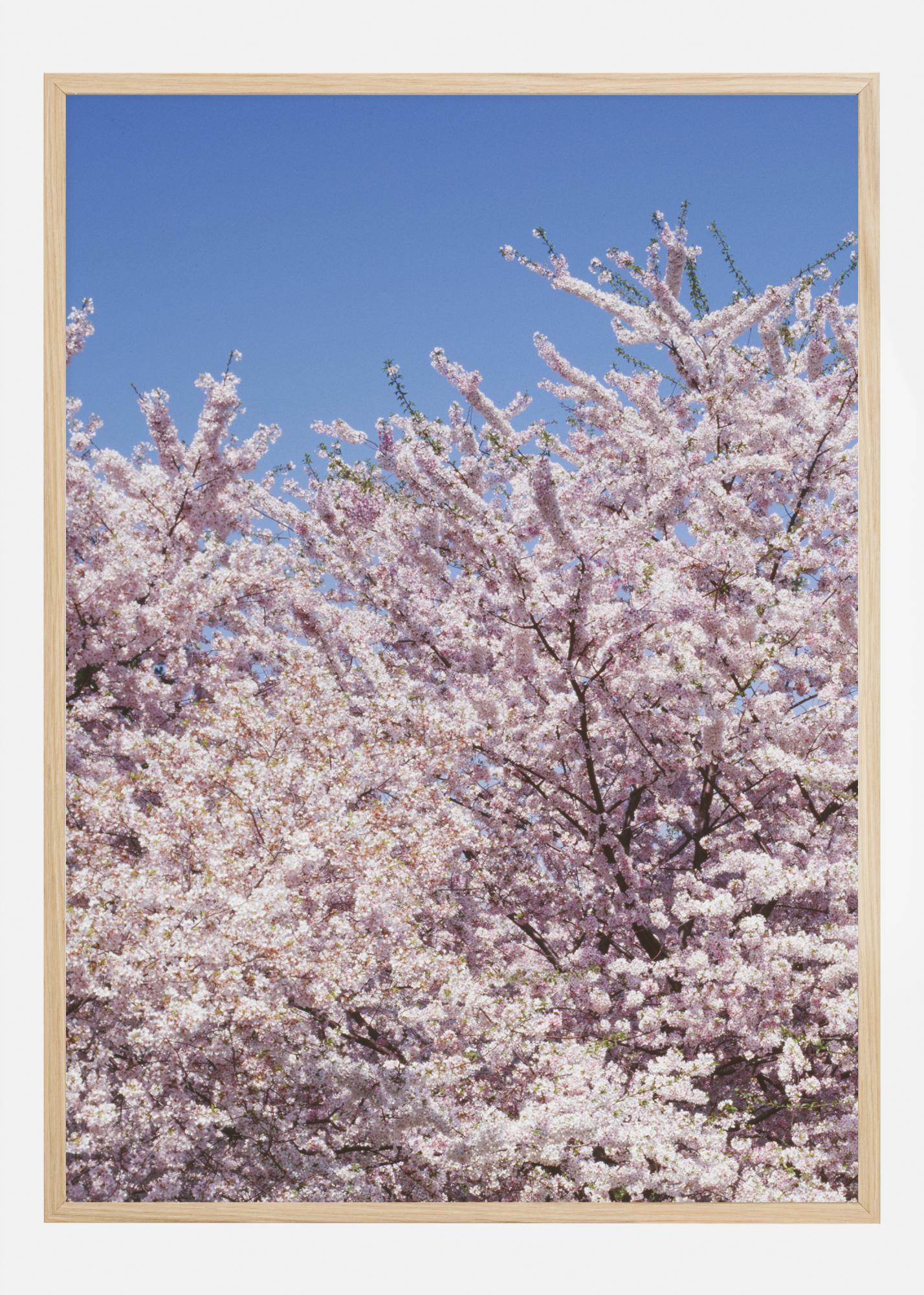Un póster de naturaleza con árboles de cerezo con flores blancas contra un cielo azul claro. Las flores blancas llenan esta imagen y contrastan fuertemente con el cielo. Cuelga esta imagen y deja que tu hogar se llene de una sensación de naturaleza cuando veas esta obra en tu pared.