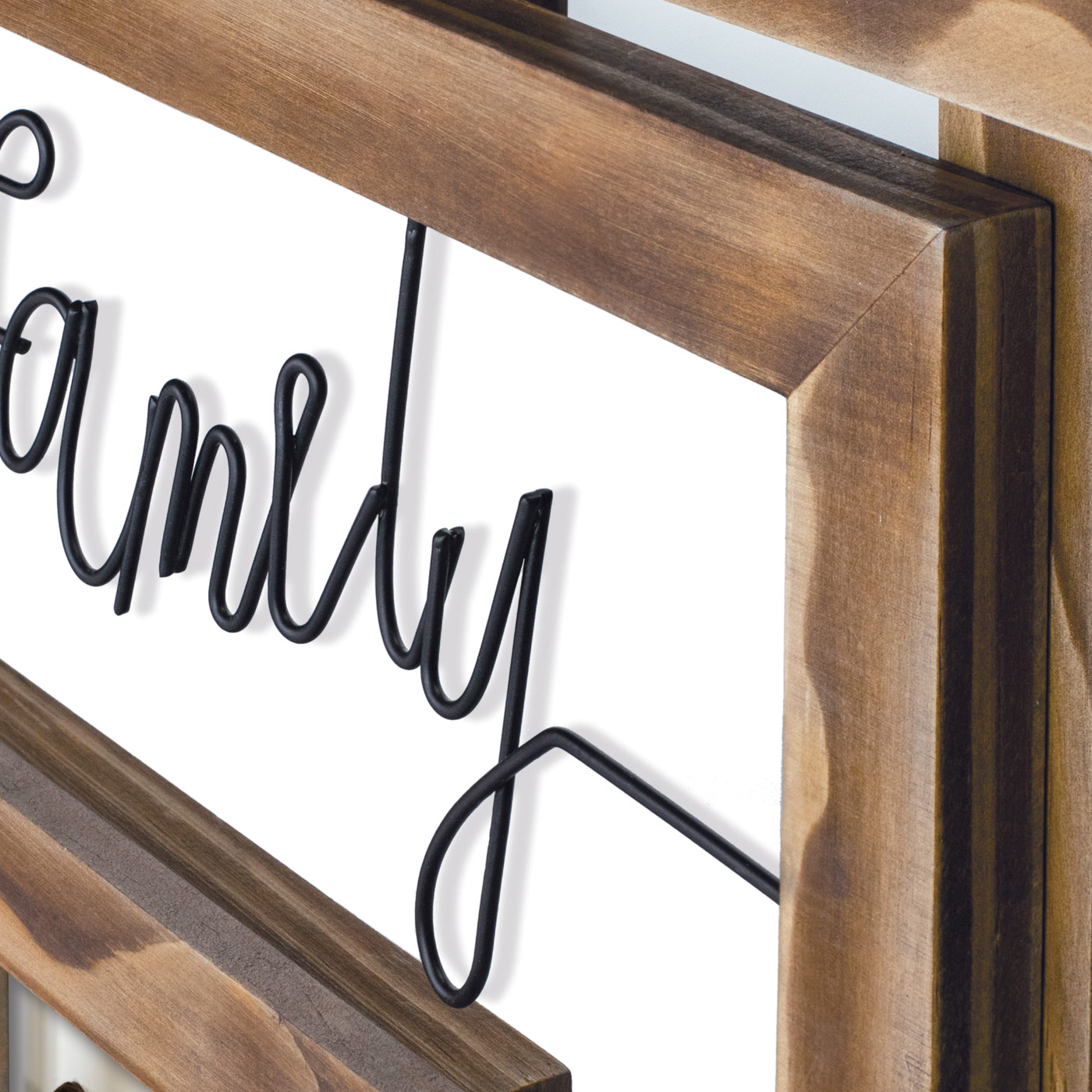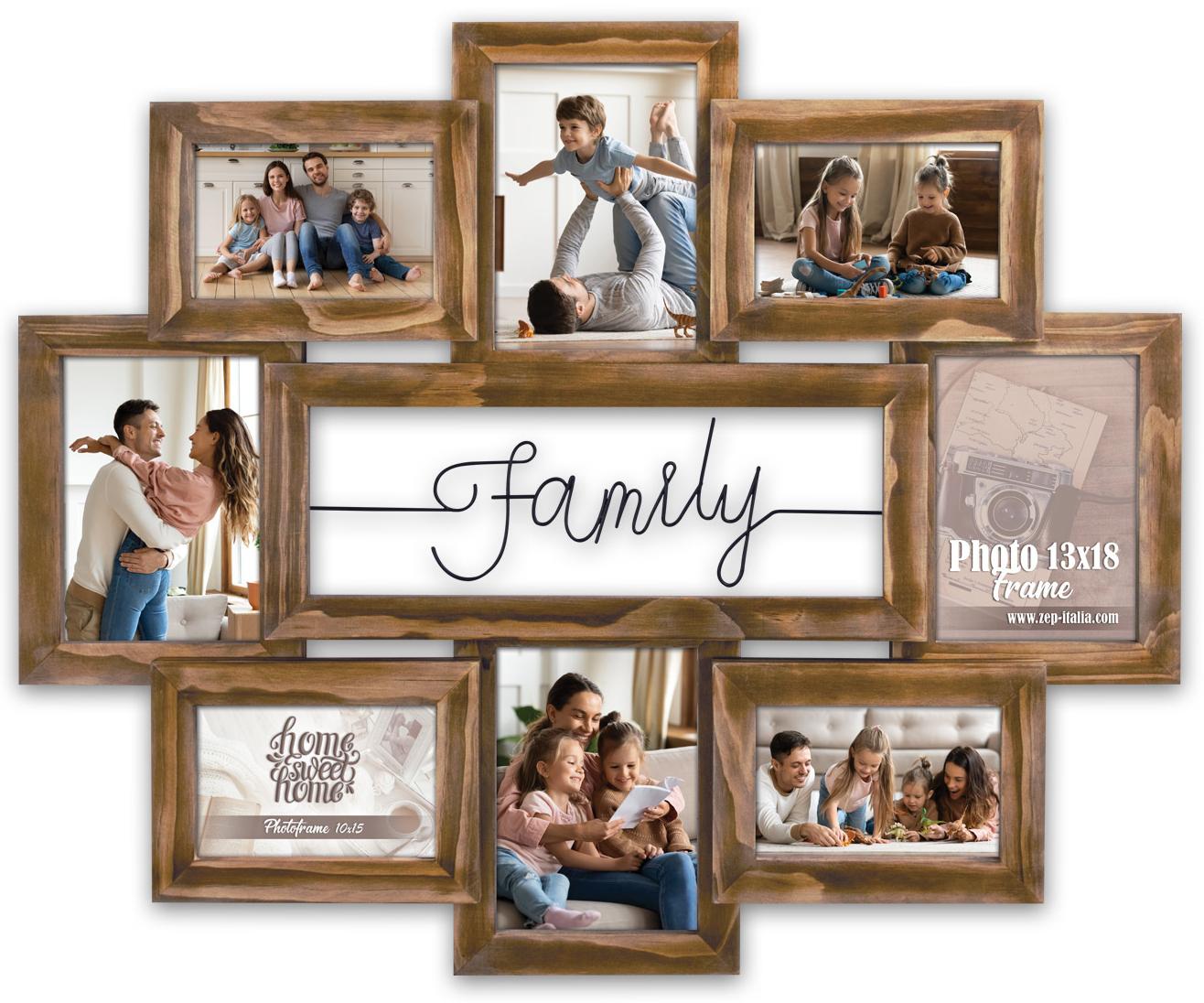 Este bonito marco collage es perfecto para mostrar tus mejores recuerdos en familia. El marco tiene un tono cálido de madera en color marrón y en el centro, entre los marcos, se encuentra la palabra "familia" en letras negras. El marco tiene capacidad para 8 fotos en tamaño 10x15 cm y 13x18 cm. Incluye soporte para colgar en la pared.