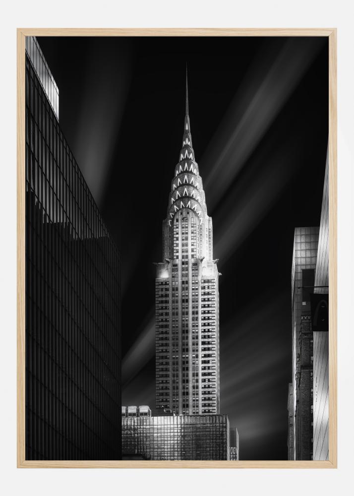 Un póster nocturno con el edificio Chrysler en Nueva York iluminado. El edificio se encuentra frente a un cielo negro en el centro de la foto. Rayos de luz blancos sobre el cielo crean ángulos y drama. Haz una declaración audaz con esta foto dramática en blanco y negro.