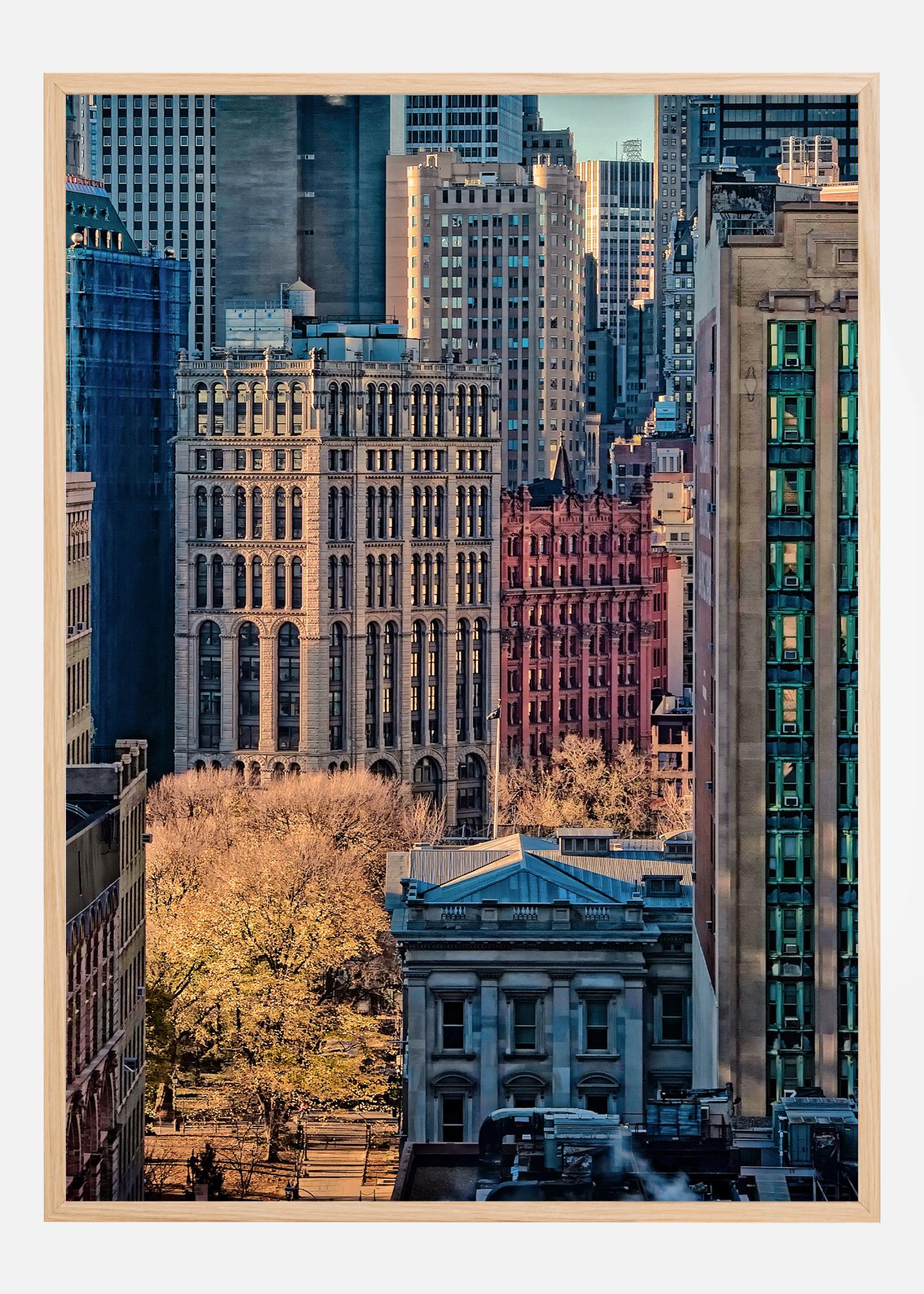 Un póster de paisaje urbano con edificios antiguos y nuevos. Los árboles de otoño y los edificios de ladrillo rojo contrastan de manera fantástica con los rascacielos azules más fríos. Imagínate mirando por la ventana de tu casa esta concurrida plaza de la ciudad cuando tengas esta imagen en tu hogar.
