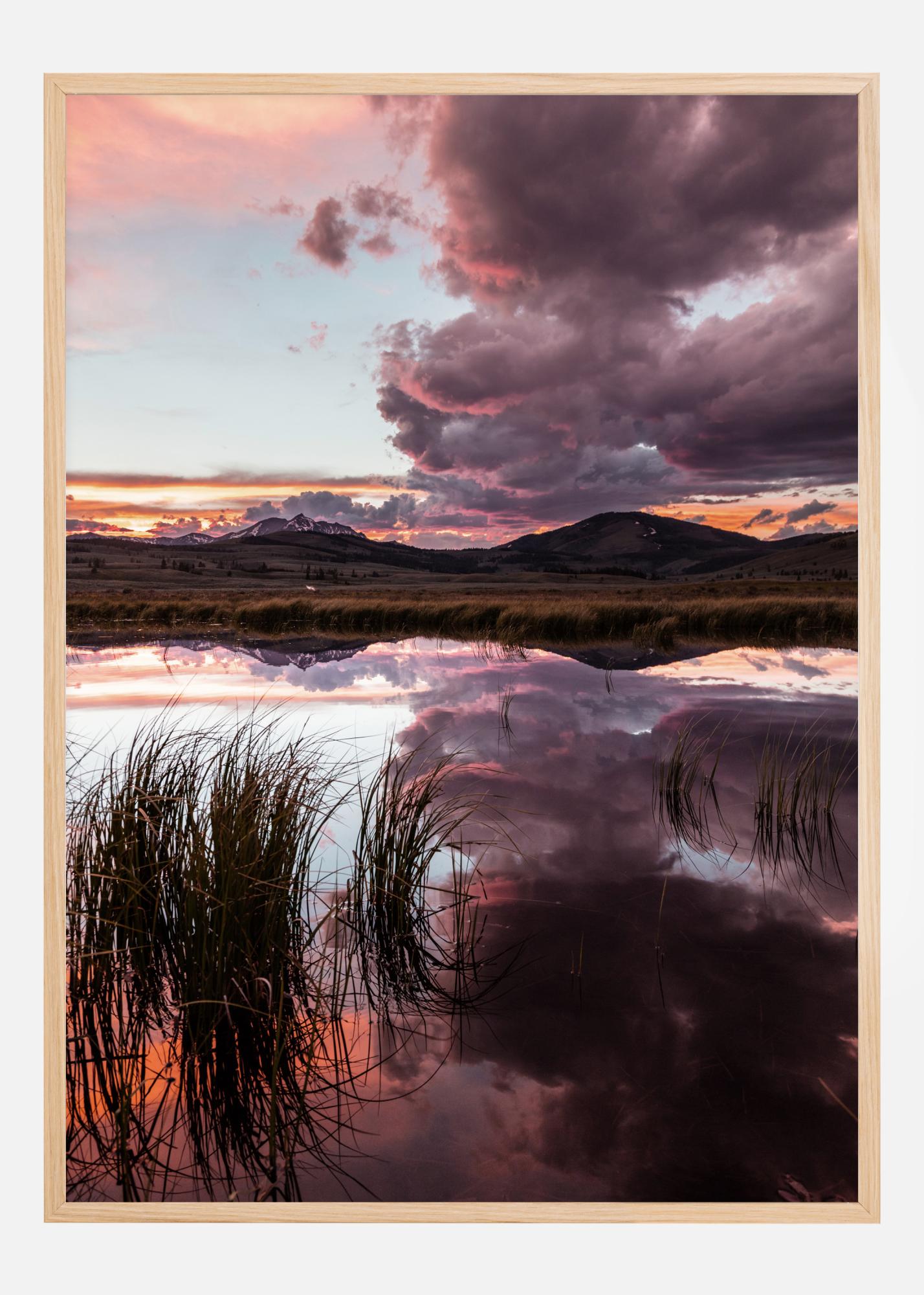 Un paisaje con un lago, juncos y nubes sobre el horizonte. Los juncos están en el lago y se mecen con el viento mientras grandes nubes se desplazan por encima y se reflejan en la superficie del agua. Dos filas de nubes dirigen la mirada hacia el horizonte y la puesta de sol rojiza. Disfruta del drama en esta obra de tonos pastel intensos.