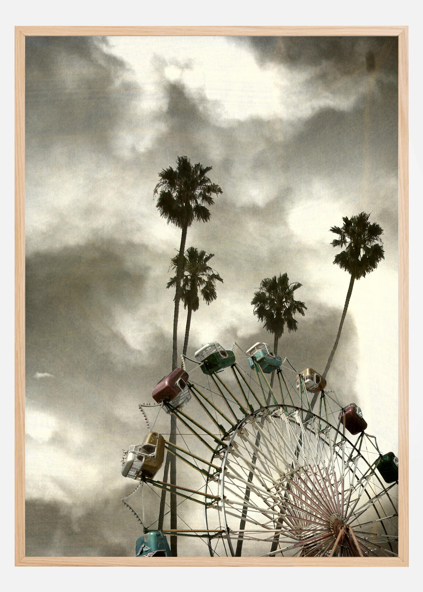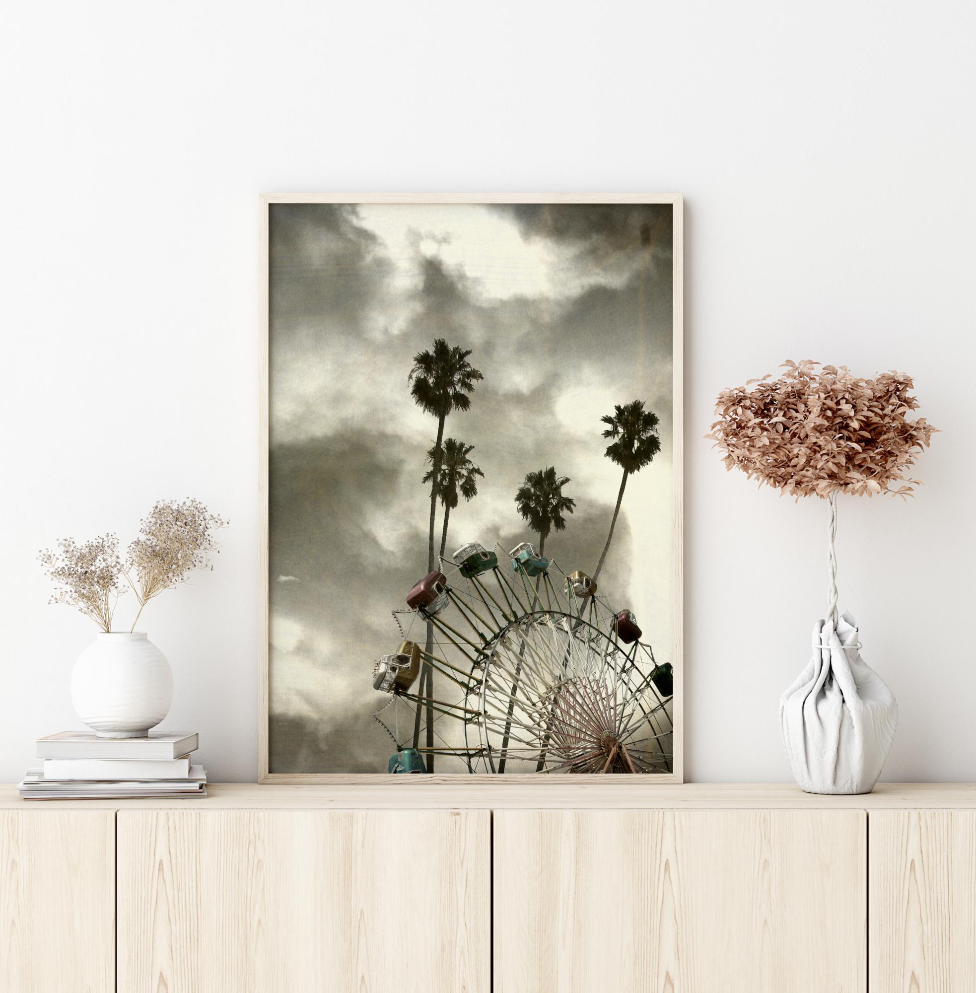 Un póster fotográfico de una noria similar a la del Parque de Atracciones con vagones en hermosos tonos pastel, sobre un fondo de palmeras y un cielo llamativo. Un hermoso póster con mucha sensibilidad.