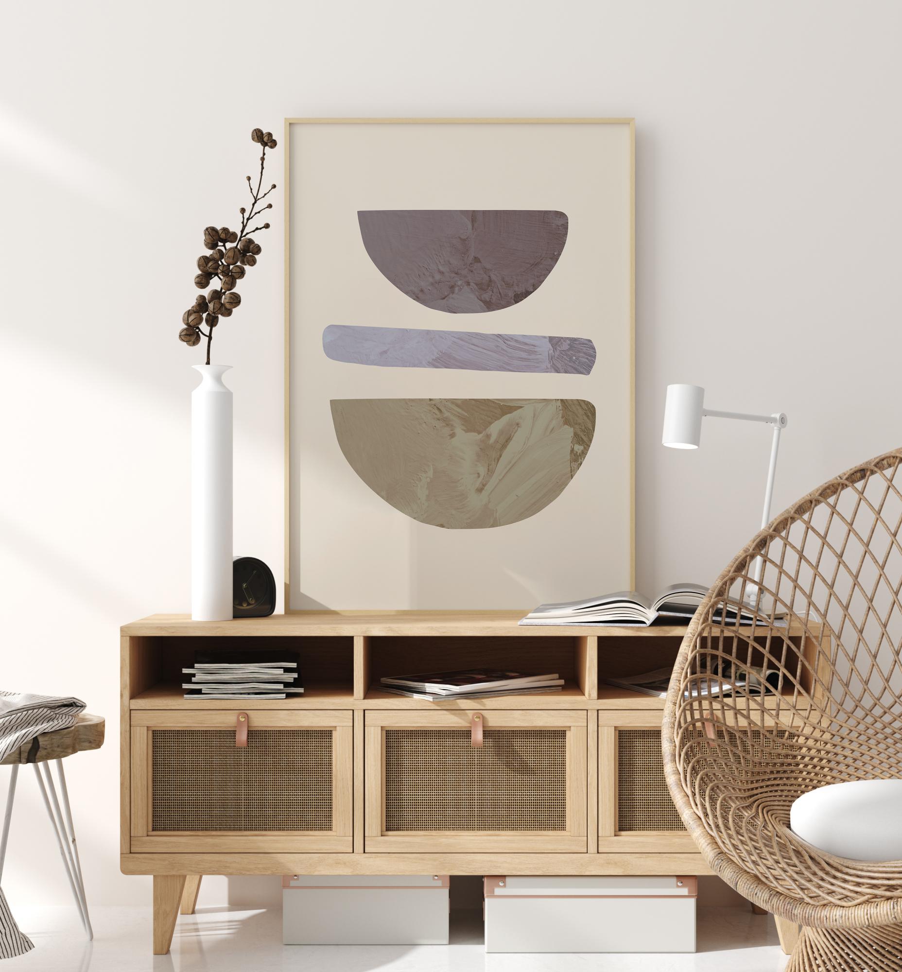 Un póster abstracto con tres formas distintas de trazos de diferentes colores. Un semicírculo grande de color crema y beige se encuentra en el borde inferior y una línea fina azul encima de él. En la parte superior hay otro semicírculo en gris y azul. Cuando cuelgas esta obra en tu recibidor de casa, se convierte en un tema de conversación inevitable.