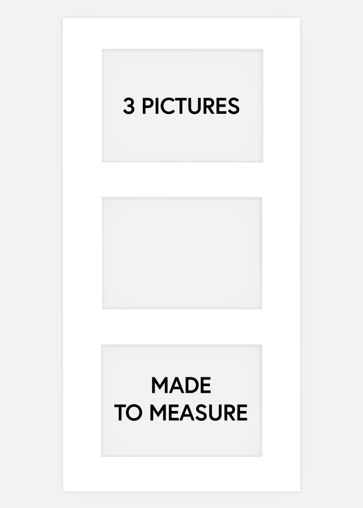 Aquí puedes pedir cómodamente paspartús de collage con espacio para 3 imágenes. Para hacer el pedido, debes indicar las dimensiones exteriores del paspartú (que deben ser las mismas que las del marco que vas a utilizar), luego debes indicar las dimensiones interiores deseasdas, que siempre deben ser 1 cm más pequeñas que las imágenes que vas a utilizar. Solo puedes hacer el pedido aquí si tienes tres imágenes del mismo tamaño, si deseas paspartús de collage más avanzados, debes contactar a nuestro servicio de atención al cliente para hacer tu pedido.