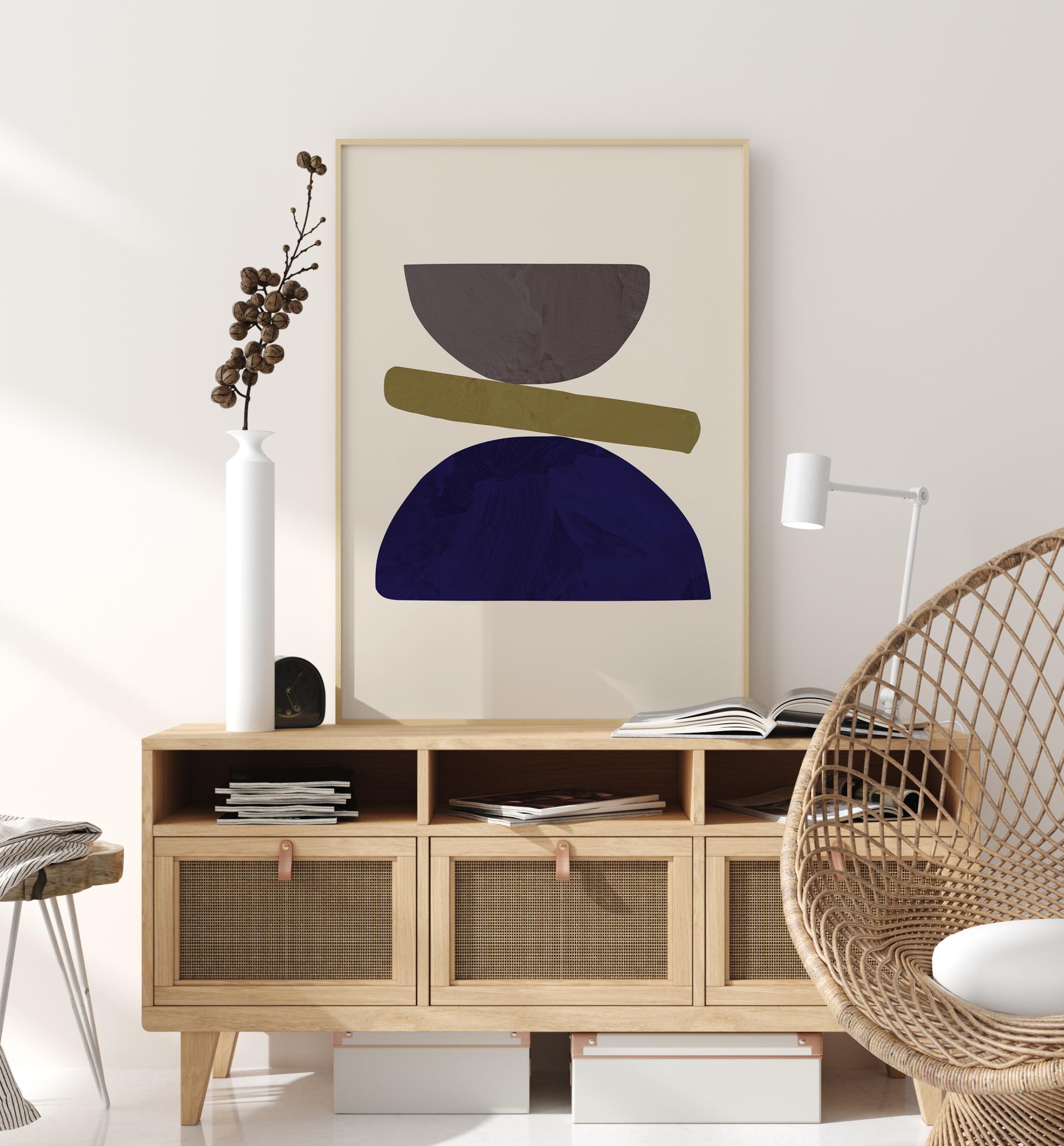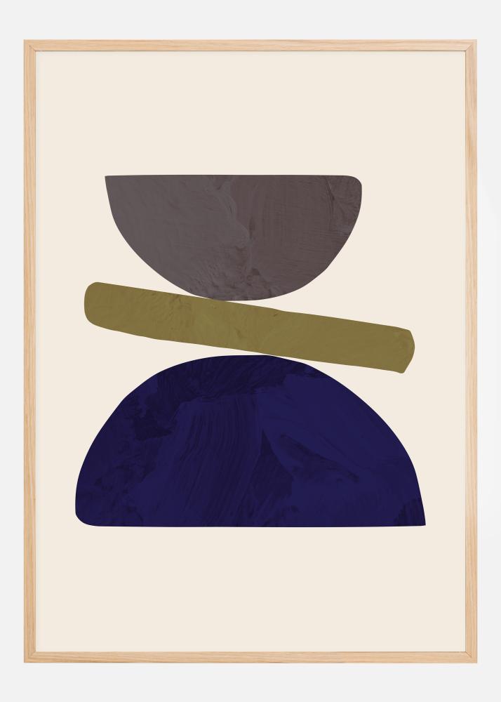 Un póster sobre el equilibrio a través de la geometría. Un gran semicírculo azul equilibra una forma alargada verde fina en su curvatura. Además, los semicírculos grises crean una forma de reloj de arena. Pasa horas frente a esta obra e intenta encontrar las otras formas en ella.
