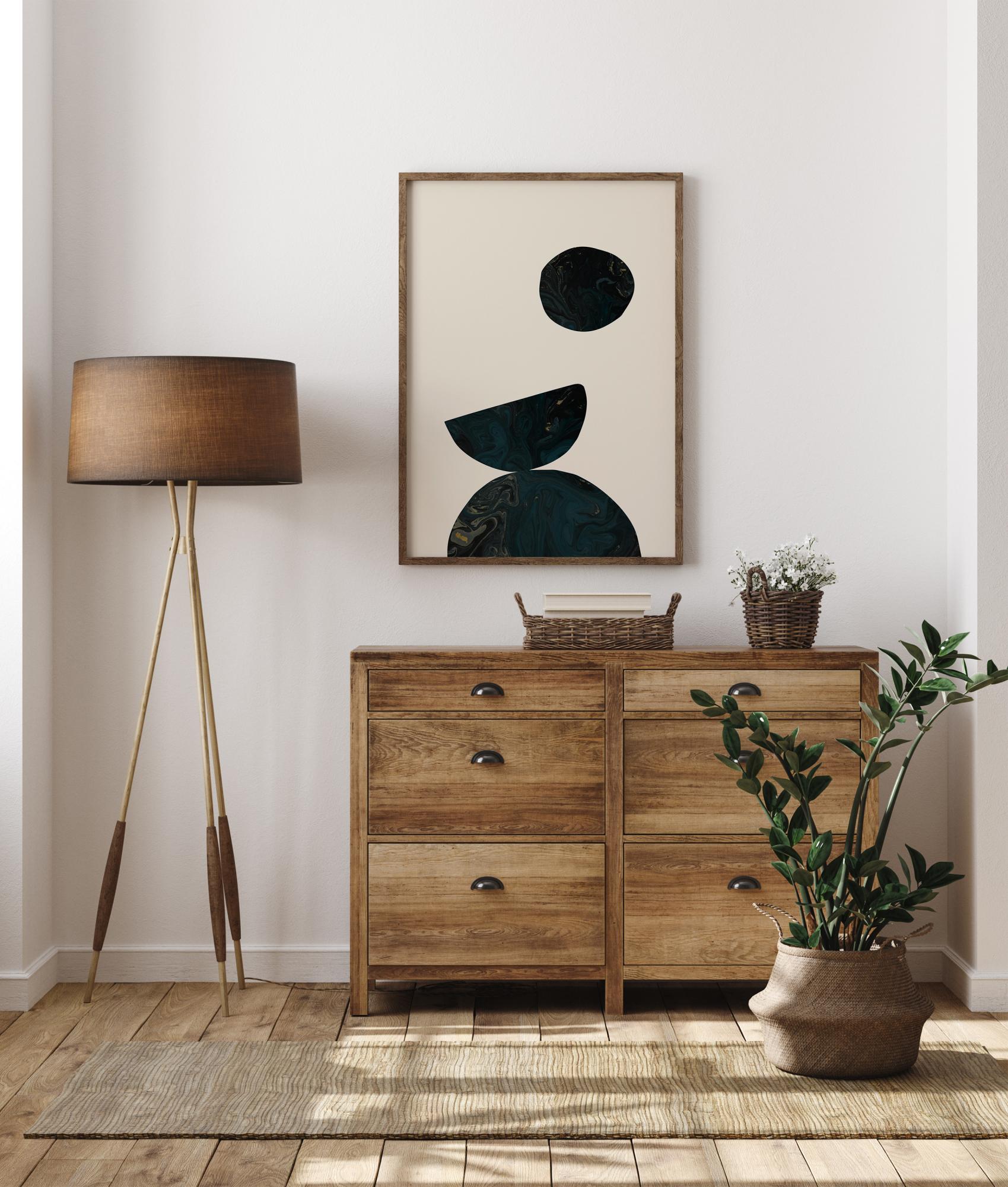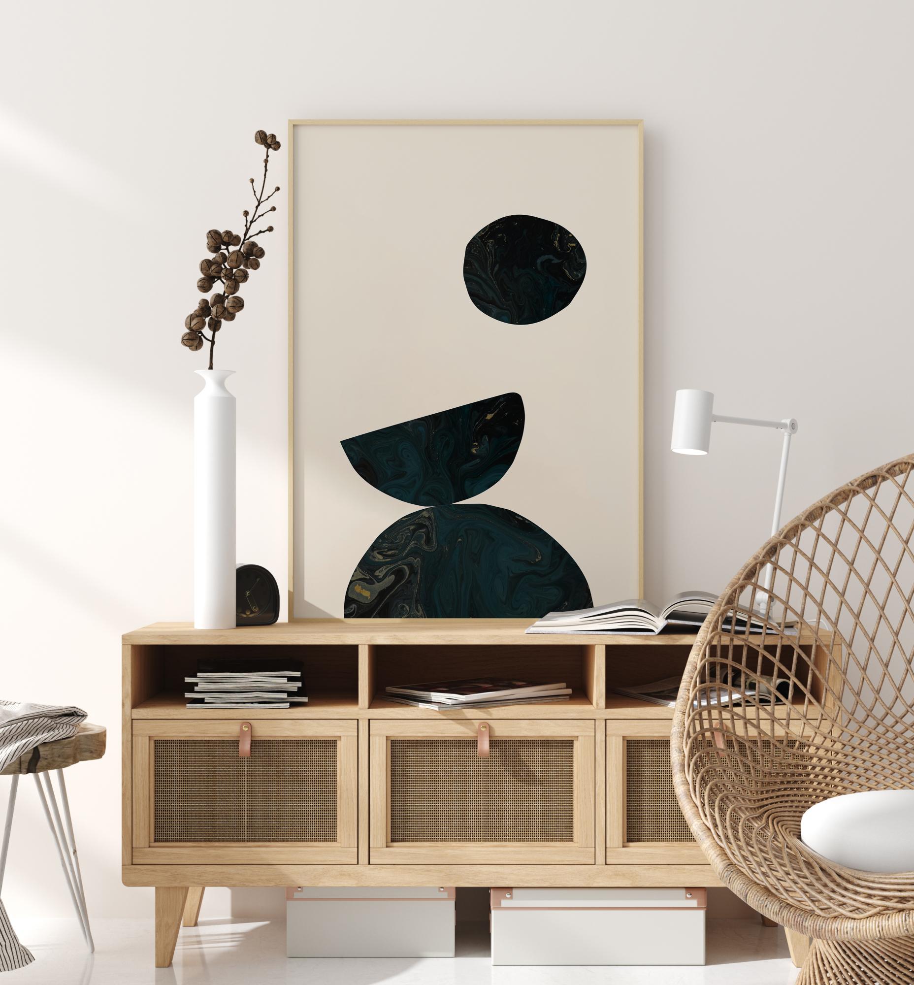 Un póster luminoso con tres formas azul oscuro y negro que crean una imagen impactante. Un semicírculo está ubicado en la parte inferior y equilibra otro semicírculo invertido. Encima flota un círculo negro. Todo esto está sobre un fondo blanco contrastante. Combina los hermosos remolinos marmolados con un tono más claro en las paredes para obtener un drama adicional.
