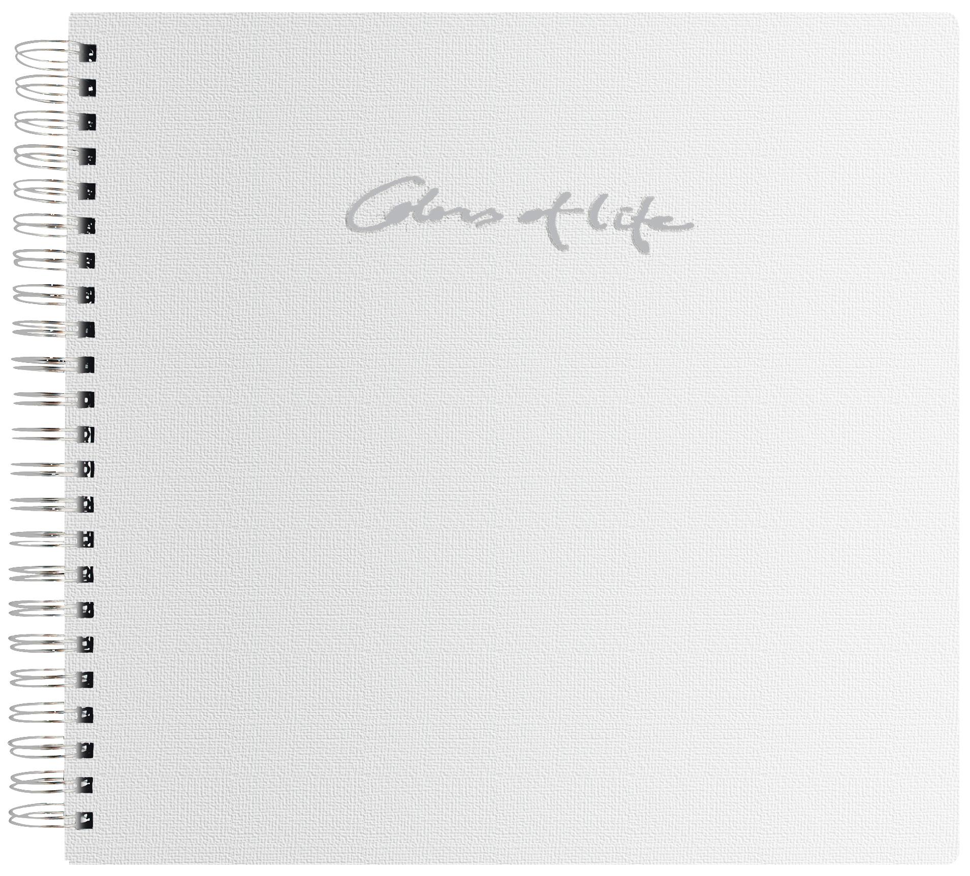 Un álbum de espiral de 30x30 cm con 24 hojas blancas libres de ácido, listo para llenarse de recuerdos! En la parte delantera del álbum se encuentra el texto "Colors of life", (Colores de la vida), en plata.