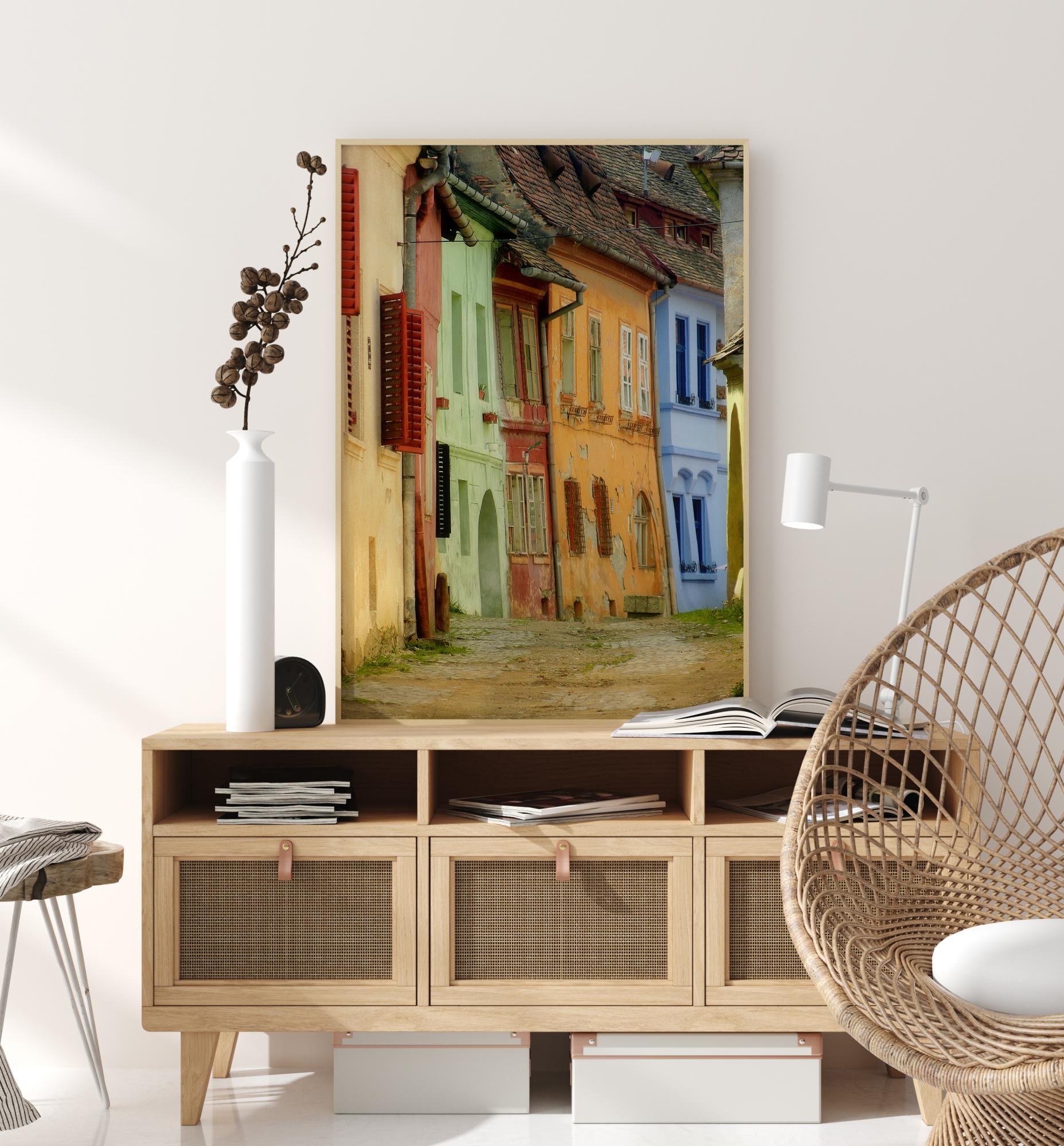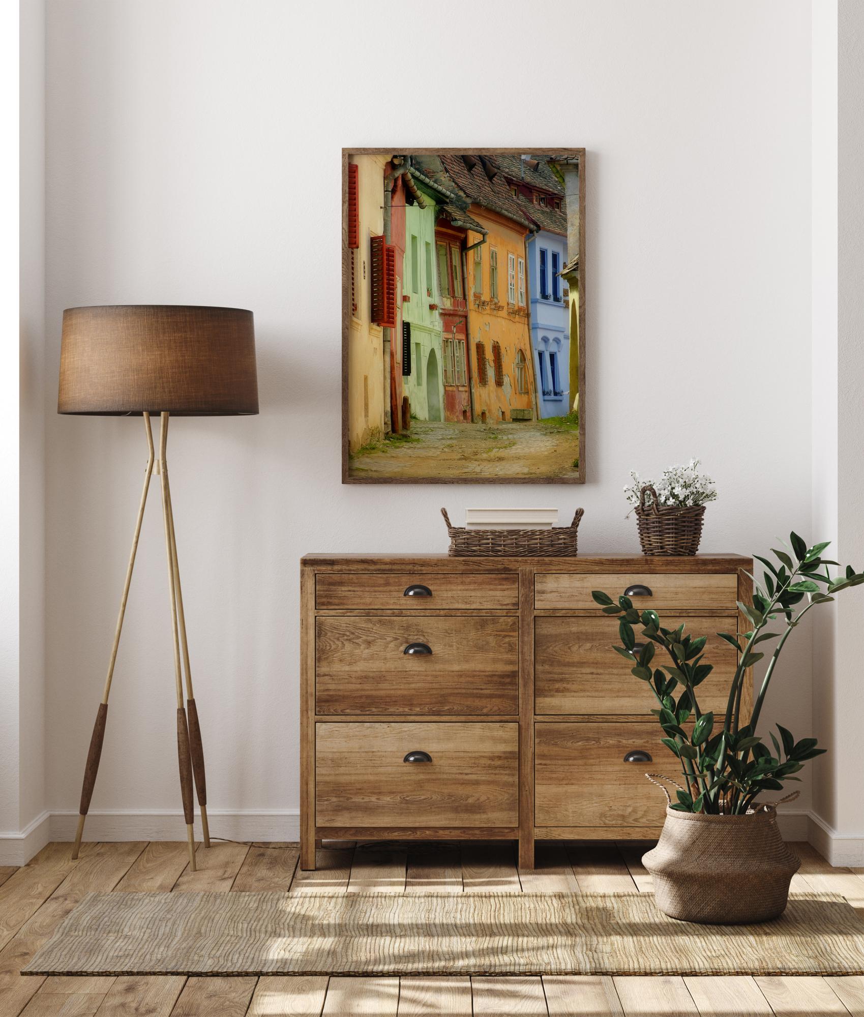 Un póster pintoresco con casas antiguas pero coloridas a lo largo de una calle estrecha. La calle empedrada conduce entre casas beige, verdes, naranjas y azules con techos de tejas y amplias persianas rojas abiertas. Disfruta de la atmósfera pintoresca y tranquila de esta encantadora escena pintoresca.