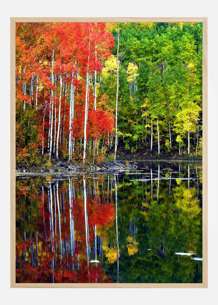 Un póster luminoso con un lago rodeado de árboles. La primavera y el otoño se encuentran en esta colorida imagen con hojas rojas a la izquierda y verdes a la derecha. Todos arrojan un reflejo brillante en el agua del lago en una escena tranquila pero vívido. Trae la alegría de la naturaleza a tu hogar con esta impresión.