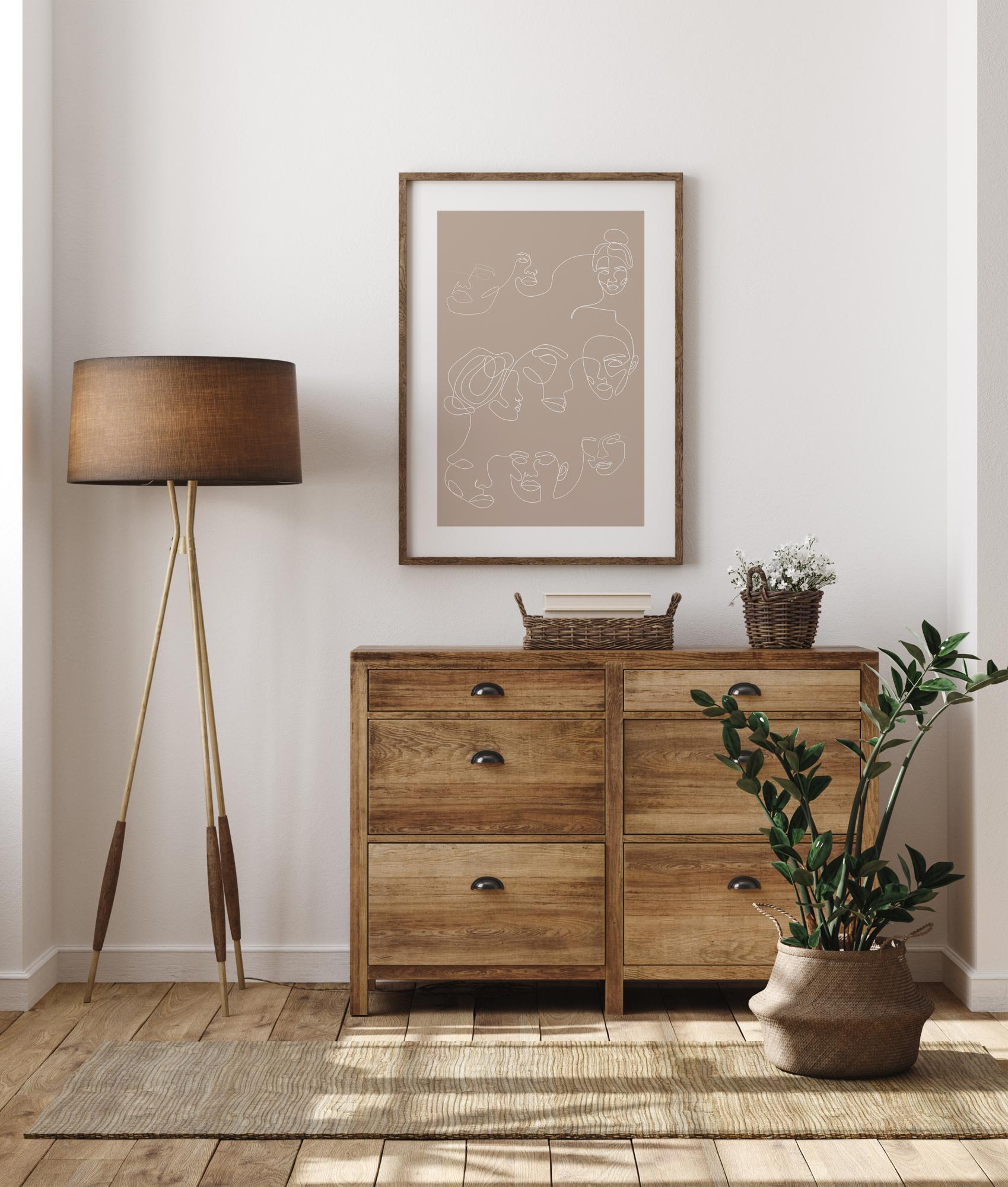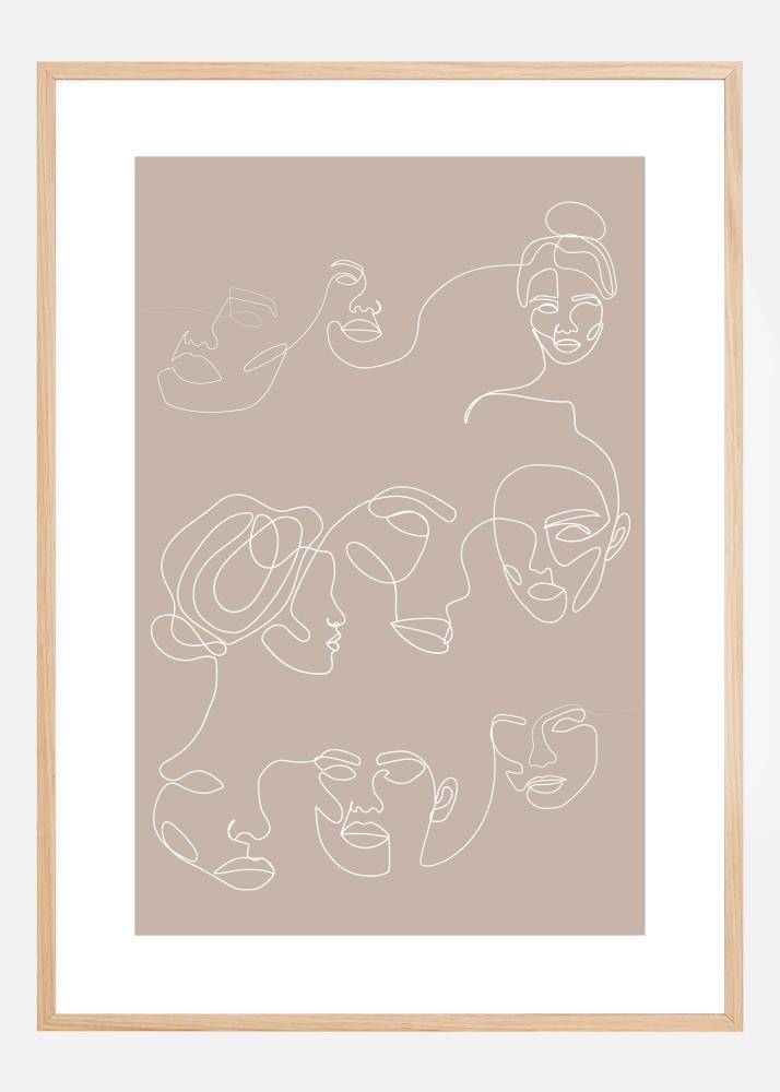 Un póster de bloc de dibujo con varios cabezas y rostros abstractos dibujados. Estas cabezas abstractas han sido dibujadas con una sola línea y están unidas en una fila larga. Las líneas blancas sobre el fondo beige funcionarían bien junto con una pared de colores audaces para crear una atmósfera artística adicional.