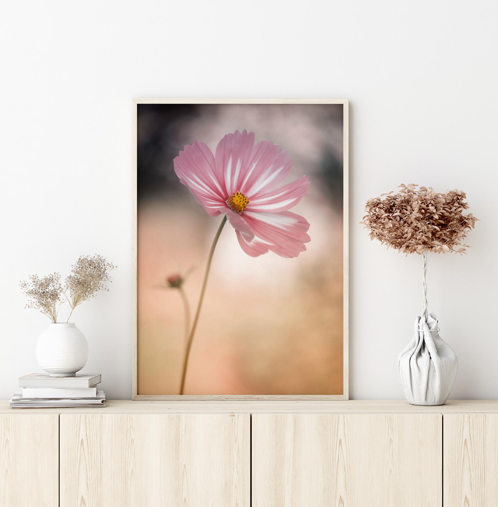 Un fantástico póster con una rosa cortada con la luz que brilla a través de los pétalos. Los pétalos rosados y el centro amarillo son brillantes con un fondo de color melocotón que le da profundidad. Siente la luz y la brisa cuando miras esta suave imagen pastel colgada en tu hogar.