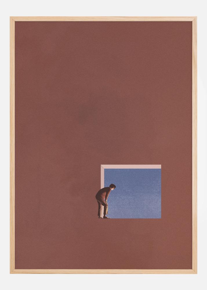 Este sugerente y conceptual póster captura a una persona inclinándose hacia adelante, mirando a través de una apertura cuadrada en un espacio azul que rompe la superficie marrón circundante. Esta imagen simple pero poderosa puede verse como una representación de la curiosidad y el deseo humano de explorar y descubrir lo desconocido. También puede ser una metáfora de la ventana de oportunidades y la importancia de aprovechar la oportunidad cuando se presenta.
