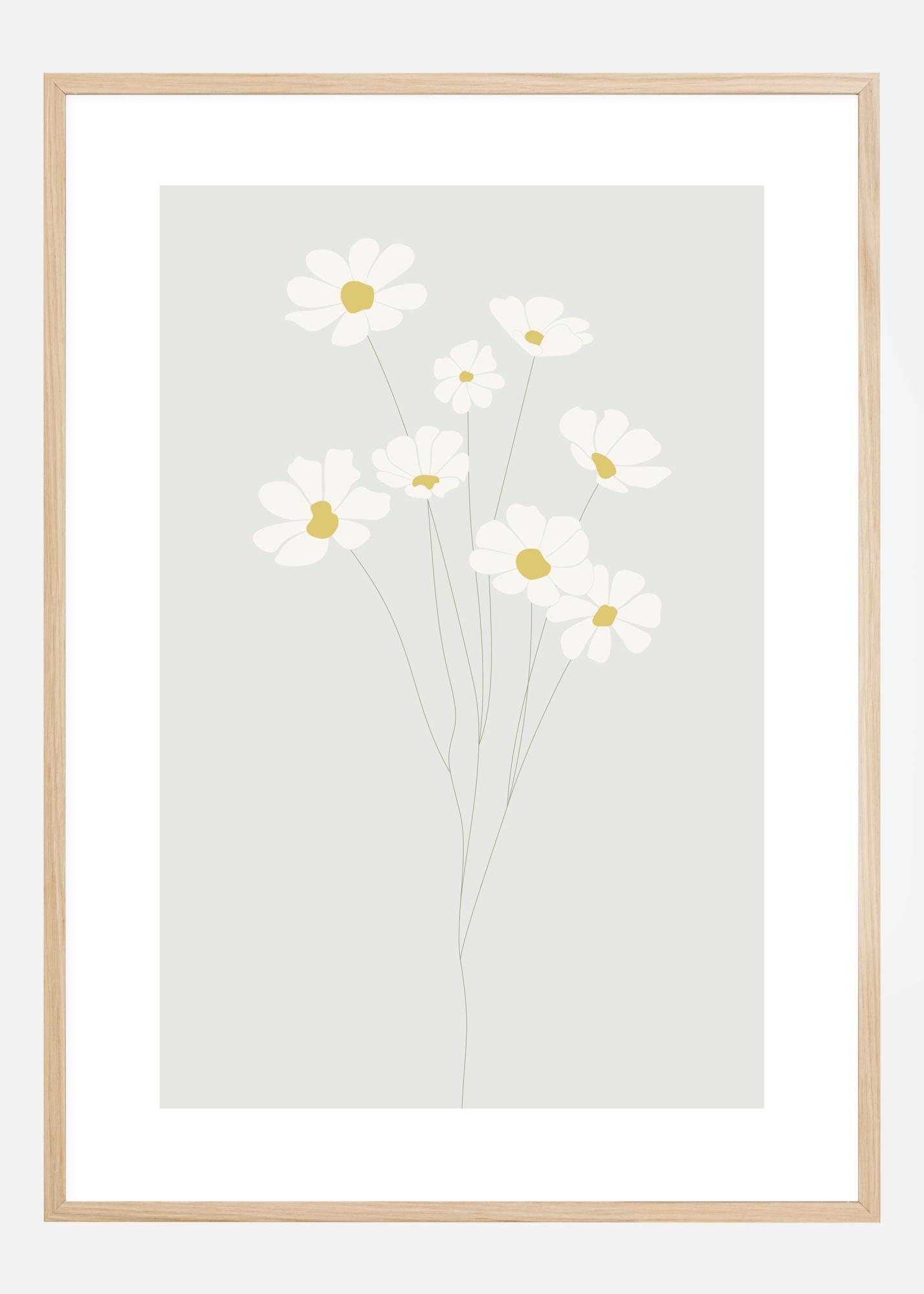 Un sutil póster con una impresión de una margarita con una apariencia delicada. Las sencillos flores blancas y amarillas se elevan en tallos finos hacia un suave fondo azul pálido. Cuelga esta imagen en la habitación de tu hijo/a para crear un ambiente tranquilo pero dulce.