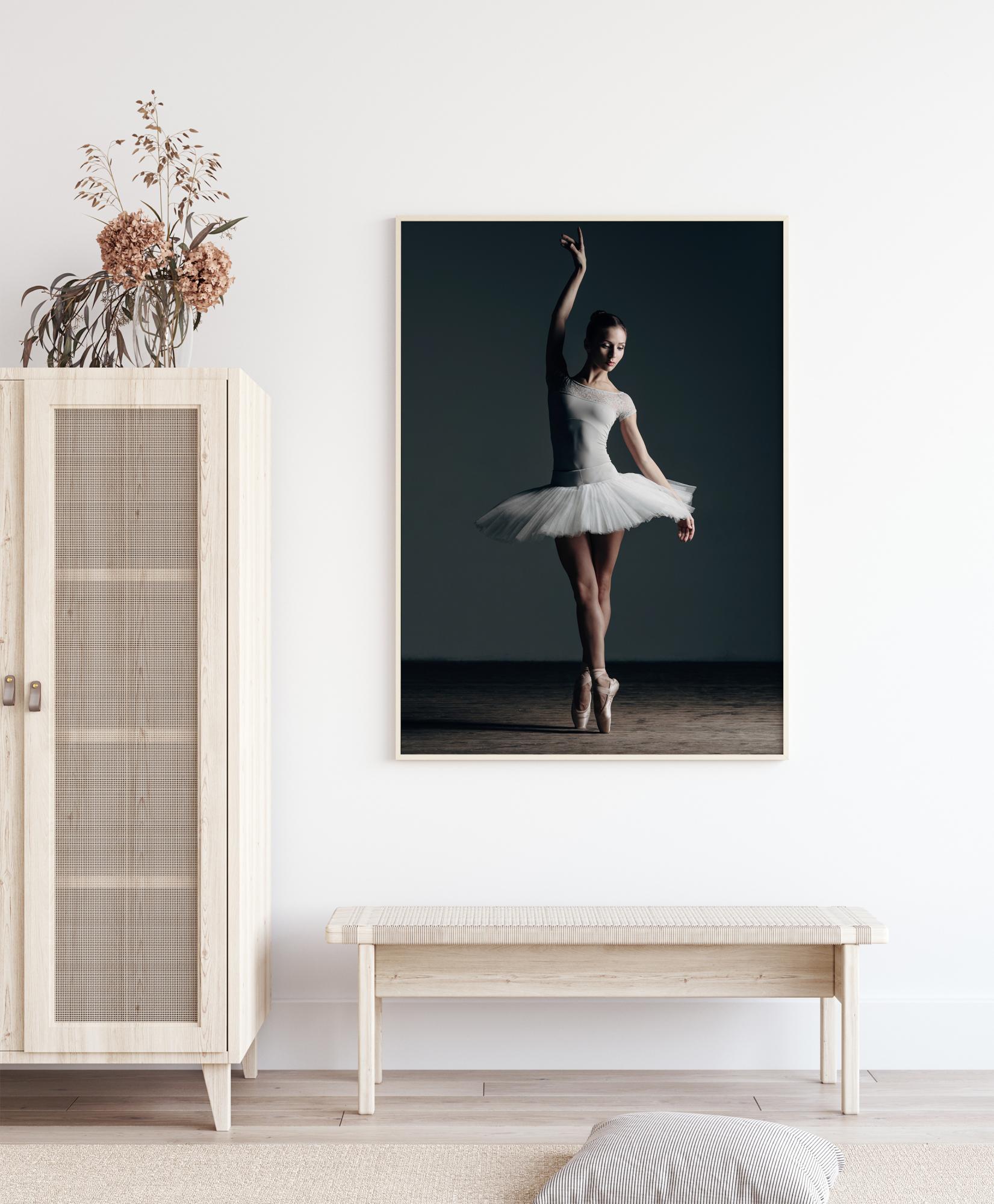 Un póster fotográfico de una grácil bailarina de ballet parada de puntillas con un brazo extendido sobre su cabeza. La iluminación en la imagen hace que su rostro y su ropa blanca contrasten bien con el entorno un poco más oscuro.