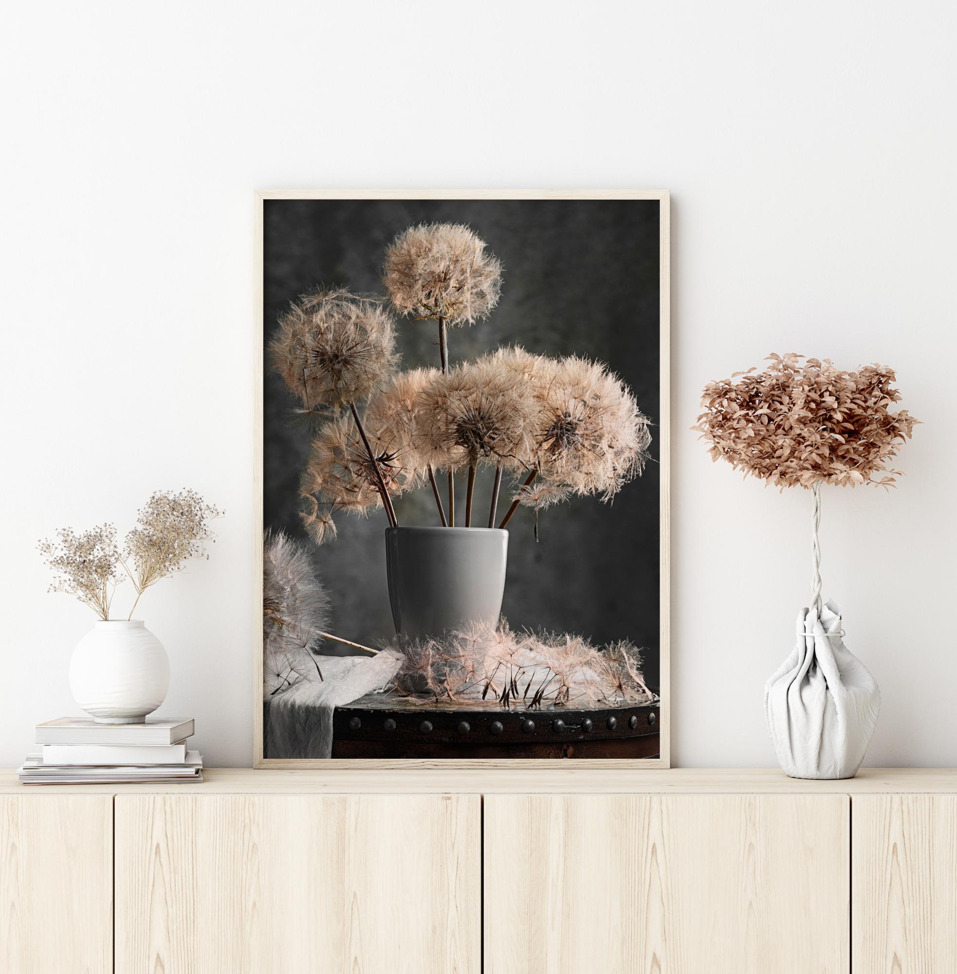 Un póster de bodegón (naturaleza muerta) con dientes de león marchitos en un jarrón sobre un fondo gris oscuro. Las semillas de los dientes de león han comenzado a caer y flotan alrededor de las cabezas de las flores. Imagina el paso del tiempo mientras te enfocas en estas flores de dientes de león marchitas.