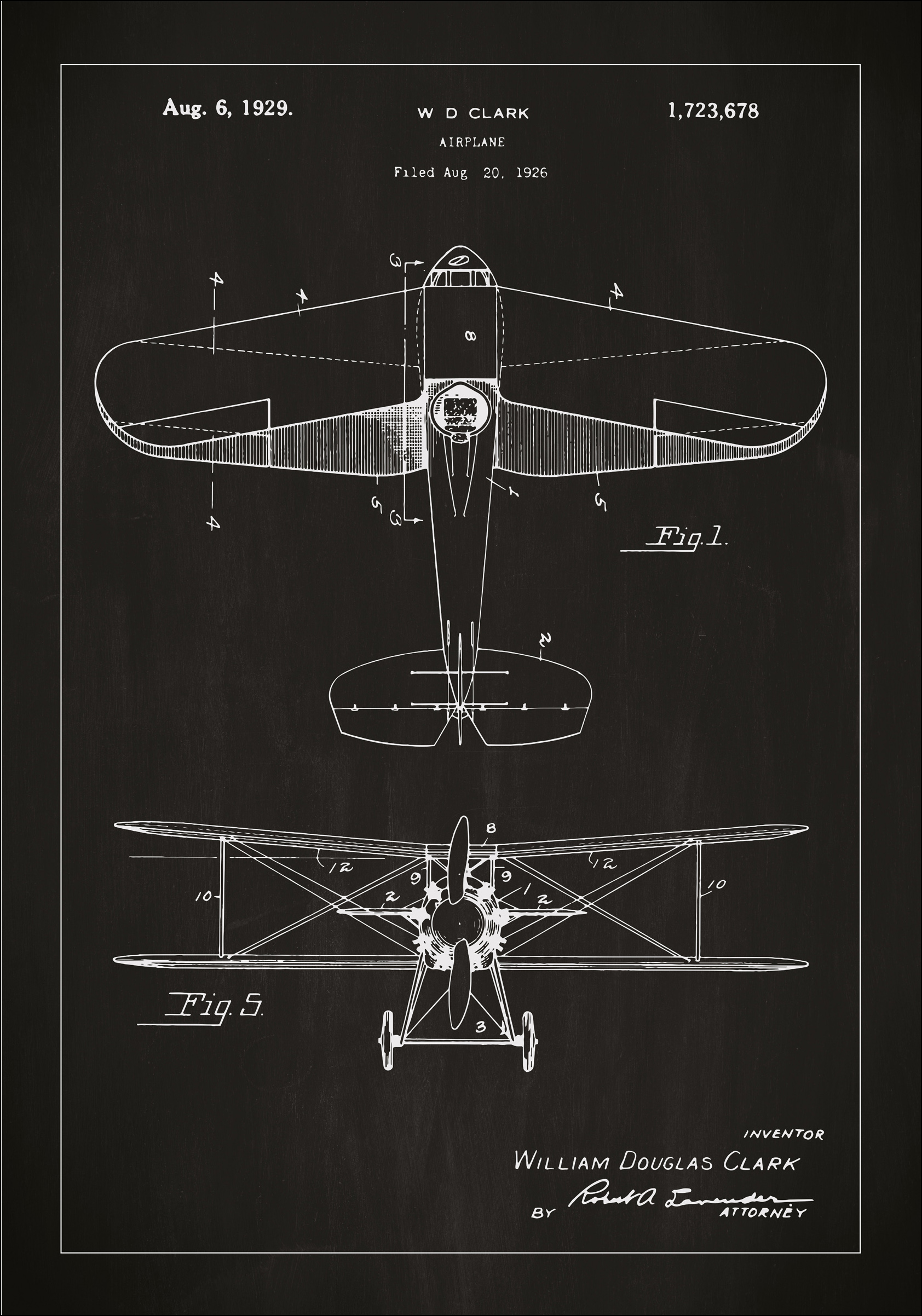 Desde el cielo hasta tu hogar, este póster de patente representa el diseño de avión de W D Clark, una creación pionera que fue otorgada con el número de patente 1,723,678 el 6 de agosto de 1929. Es una representación real del espíritu de la época, cuando la tecnología aeronáutica hizo grandes avances. Esta reproducción exacta de los dibujos originales es un homenaje a esa era de innovación.