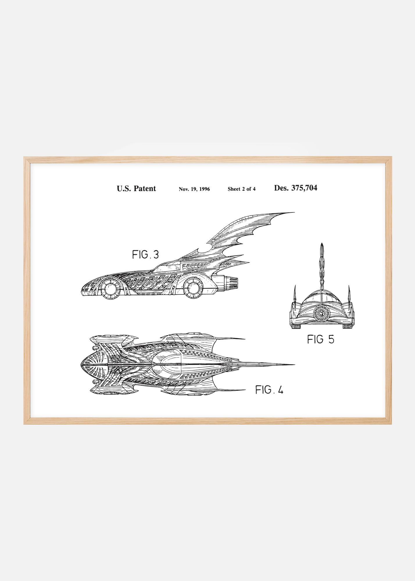 Este exclusivo póster de patente muestra elegantes bocetos del patente estadounidense Des. 375,704, fechado el 19 de noviembre de 1996. Este artístico dibujo de patente aporta una atmósfera creativa a cualquier espacio, con representaciones de un vehículo conceptual que es tanto una obra de arte como una maravilla técnica. FIG. 3 y FIG. 4 presentan un Batmobile en perfil y en vista general, brindando al espectador una sensación de su forma y estructura innovadoras, mientras que FIG. 5 se centra en la parte trasera característica y sus rasgos únicos.