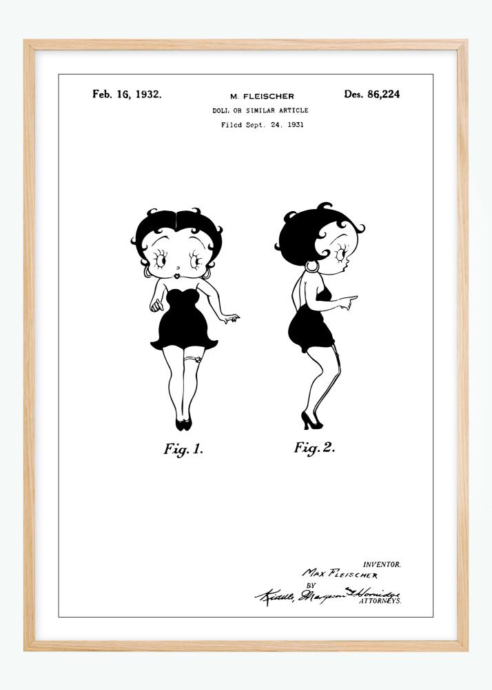 Este póster de patente juguetón y nostálgico de Betty Boop, diseñado por M. Fleischer, como se indica en la oficina de patentes de Estados Unidos el 16 de febrero de 1932 bajo el número Des. 86,224. Con una fecha de presentación del 24 de septiembre de 1931, esta ilustración refleja una era amada del diseño de juguetes. El póster, que muestra la muñeca en dos poses diferentes, es un artículo de decoración irresistible para coleccionistas o un encantador añadido a la habitación de un niño.