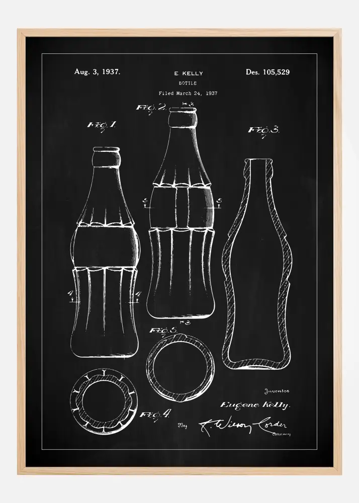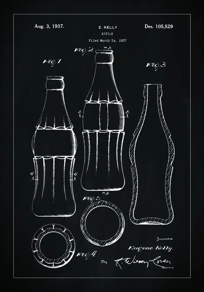 Este póster de patente retrata el diseño icónico de una botella de CocaCola, registrada el 3 de agosto de 1937 bajo el número de patente Des. 105,529. El inventor, Eugene Kelly, presentó la patente el 24 de marzo de 1937, lo que representa un hito significativo en el empaque de productos y el reconocimiento de marcas. Los dibujos cuidadosamente detallados muestran la botella desde diferentes ángulos y cortes, proporcionando una imagen completa de su forma y diseño clásico.