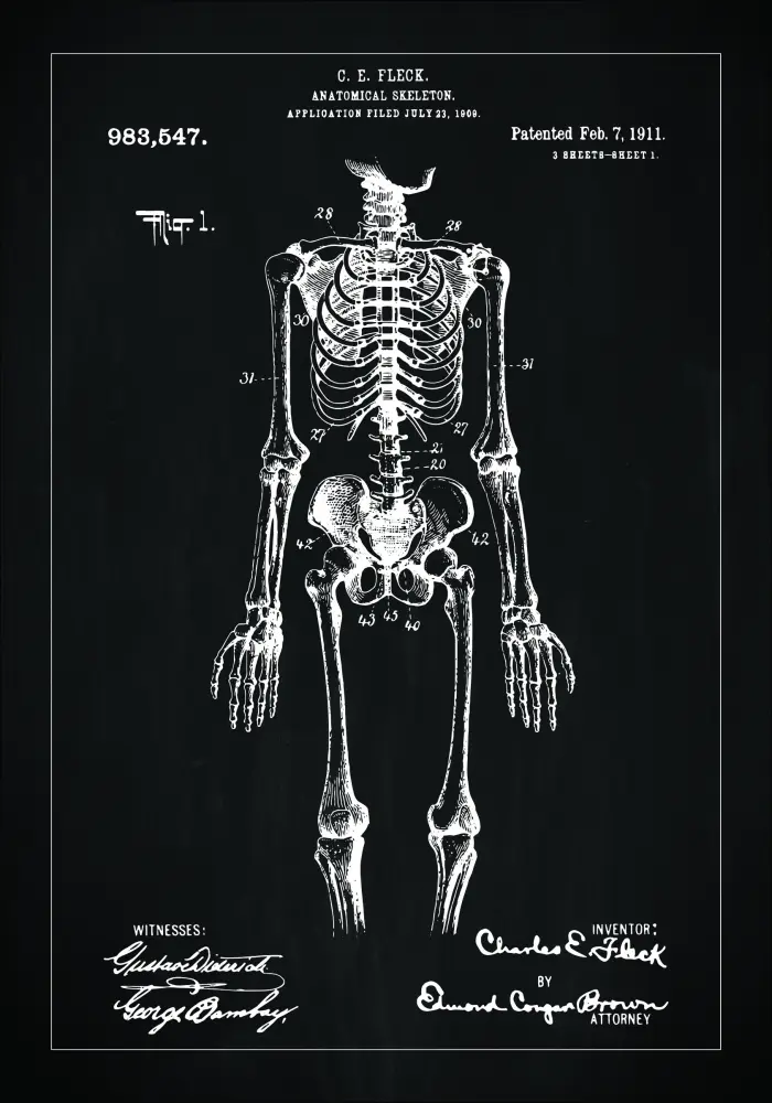 Esta fascinante póster de patente presenta el número de patente 983,547, otorgado a C. E. Fleck el 7 de febrero de 1911, para un modelo anatómicamente correcto de un esqueleto. Cada hueso y estructura está hábilmente grabado con líneas blancas sobre un llamativo fondo negro, lo que resulta en una visual que es tanto educativa como artística. Es una ilustración espectacular que demuestra las maravillas y la complejidad del cuerpo humano.