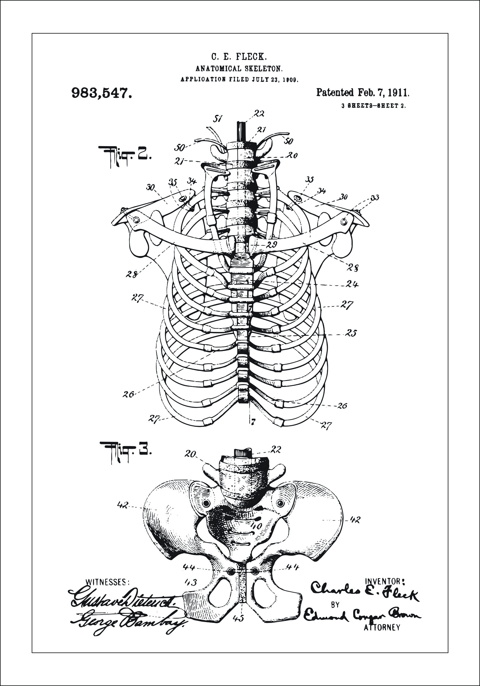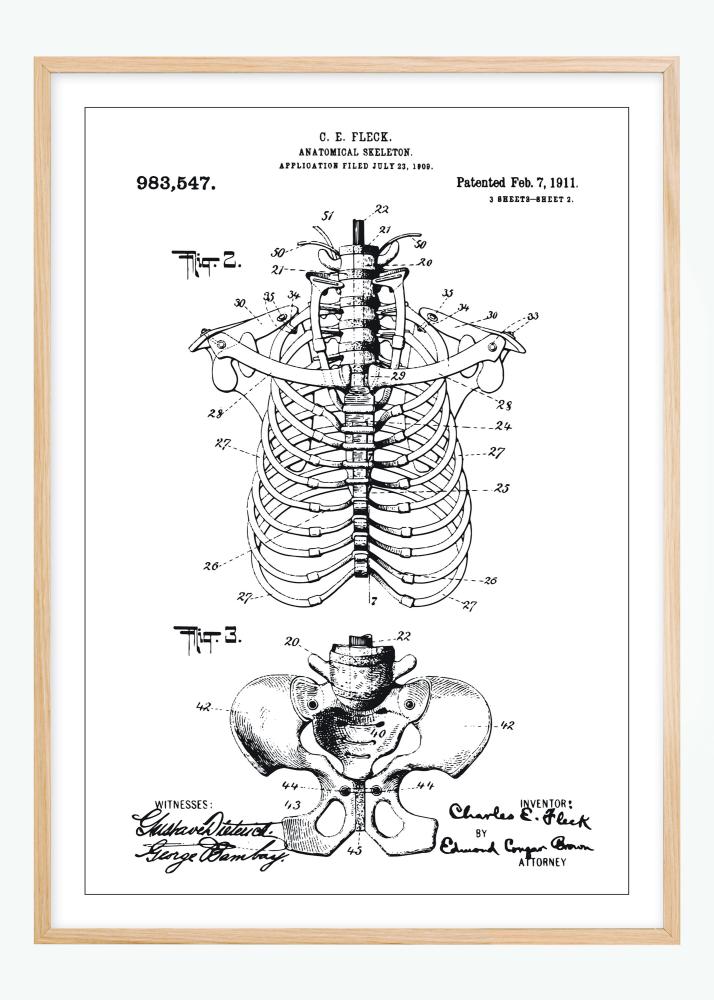 Este póster de patente presenta una ilustración detallada de una construcción anatómica del esqueleto, patentada por C.E. Fleck el 7 de febrero de 1911, bajo el número de patente 983,547. El dibujo, que fue presentado el 23 de julio de 1909, destaca la estructura del esqueleto y las conexiones mecánicas, específicamente cómo están construidas las costillas y la columna vertebral para representar la anatomía humana de manera precisa y pedagógica.