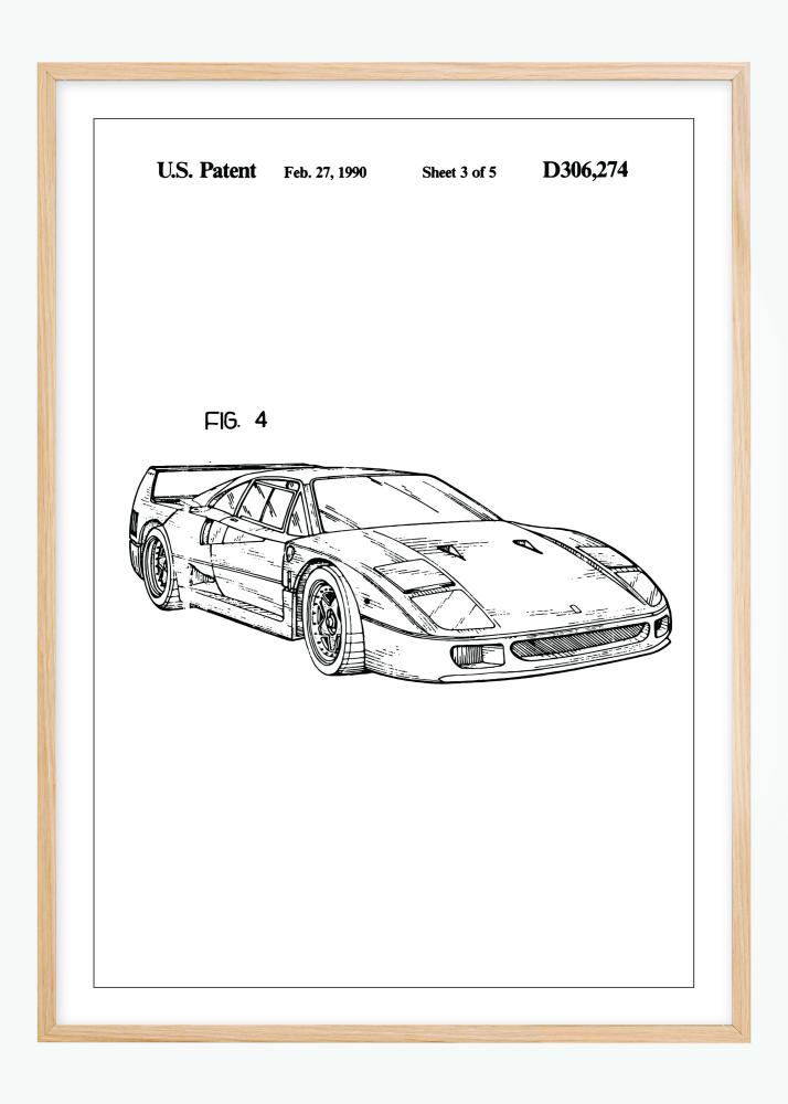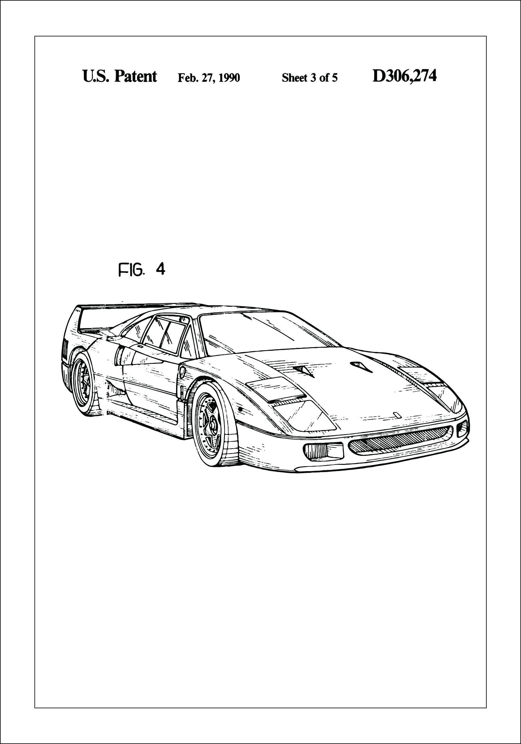 Este póster de patente representa un diseño innovador de un Ferrari F40, detalladamente elaborado el 27 de febrero de 1990, bajo el número de patente D306,274. La ilustración muestra un lado de lo que se convertiría en uno de los coches deportivos más icónicos de la historia, conocido por su aerodinámica y estilo distintivo. Es una imagen de innovación y progreso en la industria automotriz, que capta la atención del espectador con sus líneas nítidas y forma dinámica.