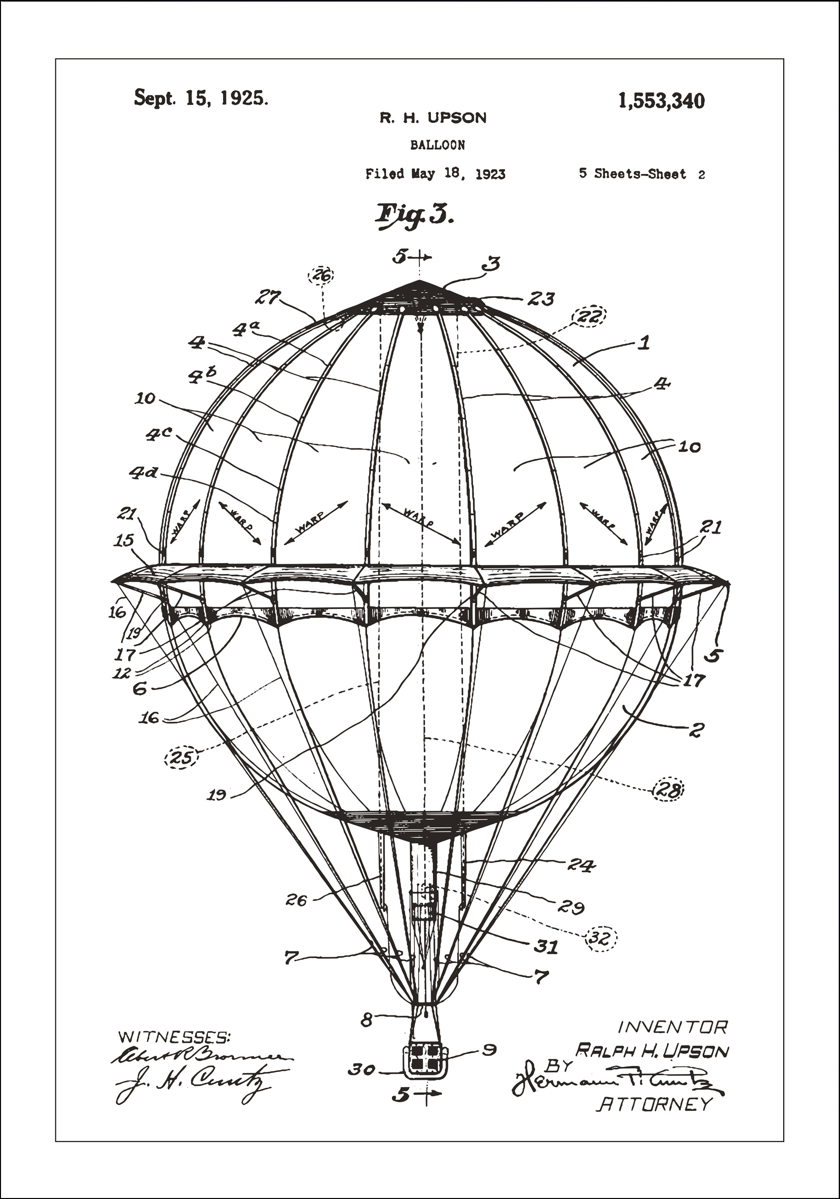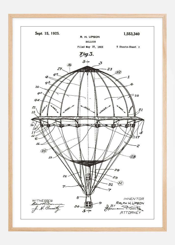 Sumérgete en un mundo de innovación temprana con este exclusivo cartel de patente que presenta el diseño de un globo aerostático, una de las muchas grandes invenciones de Ralph H. Upson. La patente, otorgada el 15 de septiembre de 1925 con el número de registro 1,553,340, muestra un nivel extraordinario de detalle y genialidad. Es un perfecto detalle artístico para aquellos con una inclinación por la historia de la aviación y la construcción.